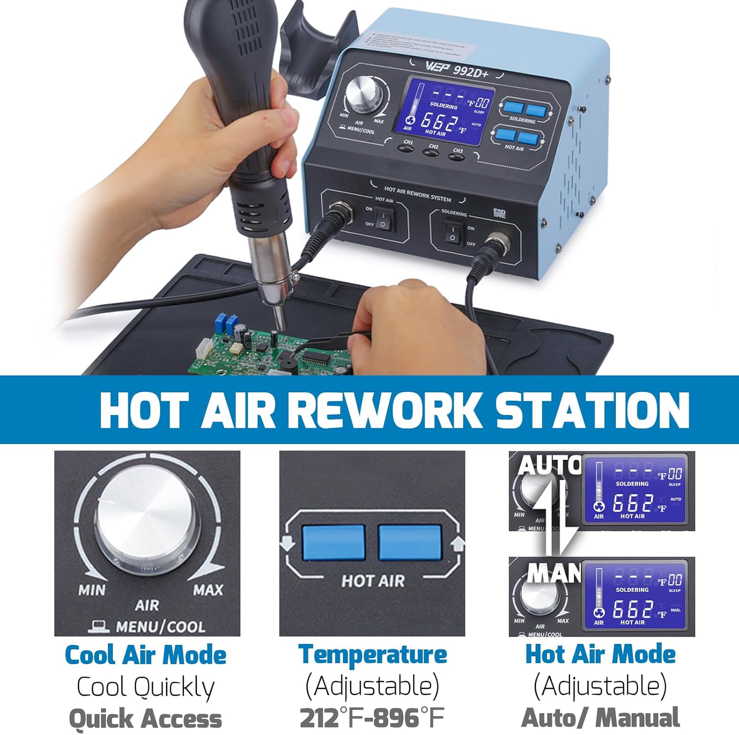 | Included Components | 5 x Soldering Iron Tips (I, B, K, 3.2D, 3C); 4 x Nozzles (large, medium, small, square); 1 x Hot Air Gun Holder; 1 x Desoldering Pump; 1 x ESD-safe Tweezers; 1 x Roll of Lead-free Solder Wire (0.5mm, 35g); 1 x Silicone Mat (330*209mm); 1 x IC Extractor |