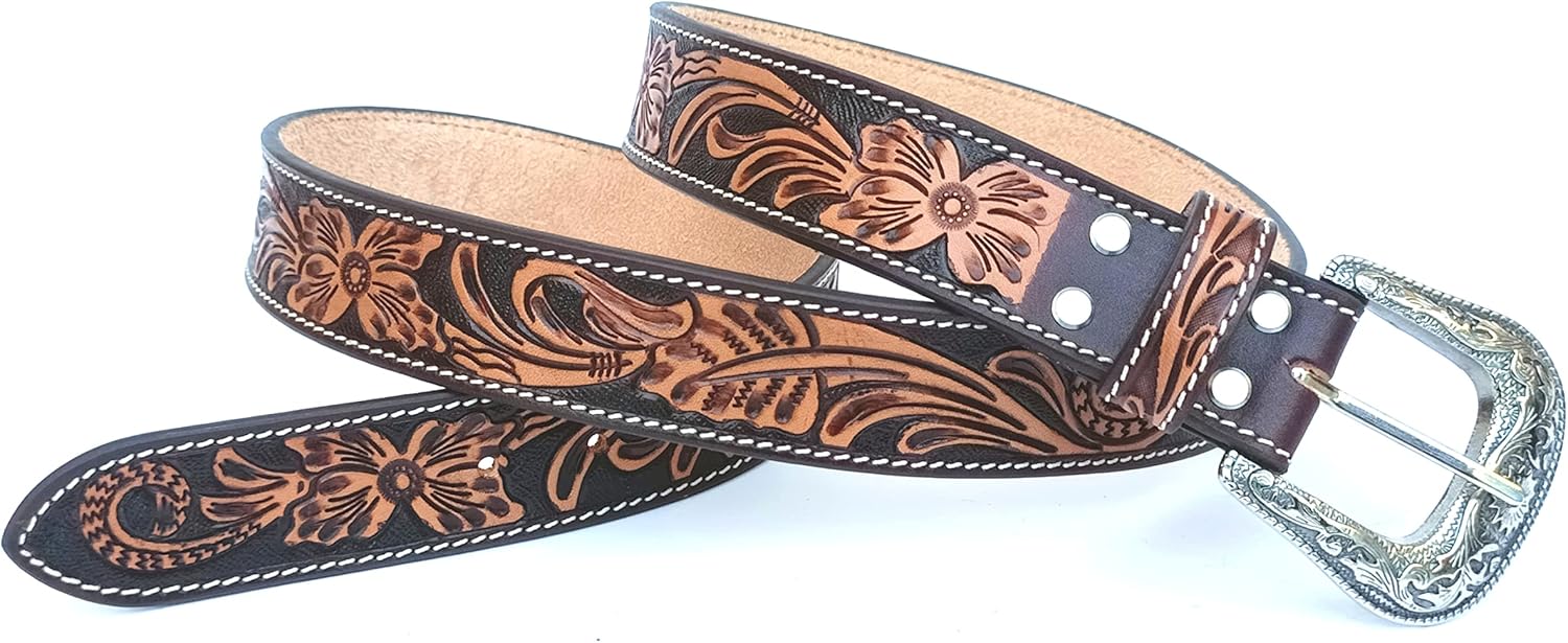 Affilare 1-1/2" wide belt made from genuine heavy-duty full grain cow leather. Belt is beautifully accented with a hand tooled antique floral finish, white contrast stitching, and unique beaded inlay. We recommend to go 2" up from your waist size for a comfortable fit. Comes with a removable antique finish buckle.