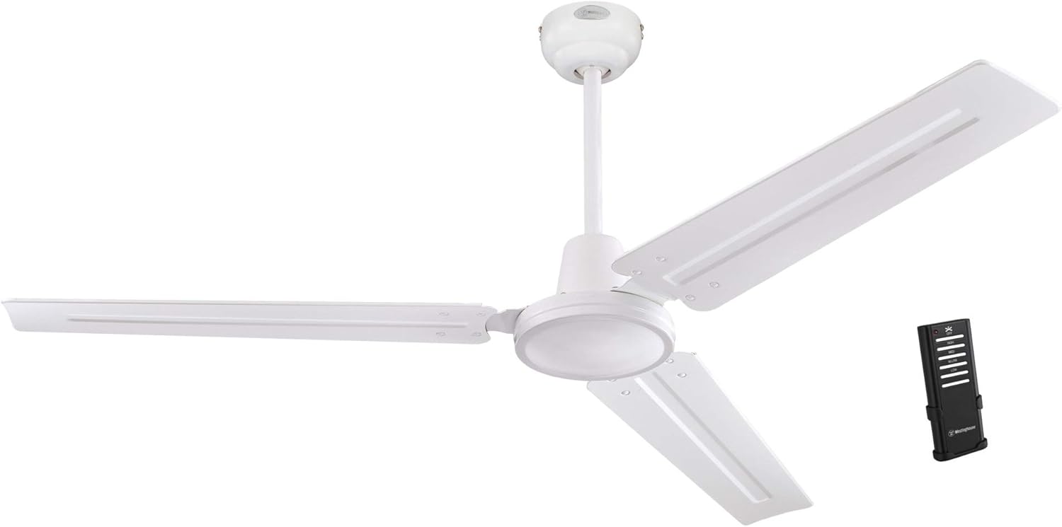 Product Description The Westinghouse Jax 56-inch industrial-style ceiling fan features a 12-inch long down rod, ideal for lofts and great rooms with high ceilings. A brushed nickel ceiling fan finish with brushed nickel steel blades adds a clean, modern feel that complements the industrial aesthetic. The Jax ceiling fan needs minimal assembly and includes a five-speed wall control for customized comfort in any room. Product reference number 78614. Amazon.com This powerful and durable Westinghouse Lighting Industrial indoor ceiling fan is designed for commercial and industrial spaces. It comes complete with a ball hanger installation system and a five-speed wall control that allows you to adjust settings over a wide range.Quiet, Efficient Circulation for Rooms up to 360 Square FeetThis Industrial fan features a 153-millimeter by 17-millimeter cold-rolled steel motor with single capacitor to quietly circulate air when you need it. Ideal for rooms up to 360 square feet (18 by 20 feet), this fan provides airflow at a rate of up to 6,254 cubic feet per minute (CFM). It is rated to operate at 60 watts at high speed (without lights), which gives it an airflow efficiency rating of 104 CFM per watt. (As a comparison, 49-inch to 60-inch ceiling fans have airflow efficiencies ranging from approximately 51 to 176 CFM per watt at high speed.)Sleek, Convenient DesignThis heavy-duty fan is specially designed to circulate air for large, open spaces. The sleek brushed nickel finish and steel blades mean this fan will suit any decor, and the included five-speed wall control means you can create your ideal environment with a simple adjustment.Please Note: Industrial ceiling fans are not recommended for use in any household applications. The sharp metal blades operate at higher speeds than traditional ceiling fans, and they must be hung at least 10 feet above the floor.Westinghouse Lighting Fans: Made to LastA trusted name for more than 120 years, Westinghouse guarantees the construction of its ceiling fans with ultimate lifetime, limited lifetime and 15-year warranties. Each Westinghouse ceiling fan has been meticulously tested to meet rigorous specifications. All Westinghouse fans are made from the highest-quality materials, including reliable, energy-saving motors, fashionable light kits, and durable blades.The Westinghouse Lighting Industrial fan is backed by a 15-year limited warranty on the motor and a two-year warranty on all other parts.What's in the BoxIndustrial indoor ceiling fan, five-speed wall control, ball hanger installation system, 78-inch lead wire, and 12-inch length by 1/2-inch diameter down rod. P.when('A').execute(function(A) { A.on('a:expander:toggle_description:toggle:collapse', function(data) { window.scroll(0, data.expander.$expander[0].offsetTop-100); }); }); From the Manufacturer This powerful and durable Westinghouse Lighting Industrial indoor ceiling fan is designed for commercial and industrial spaces. It comes complete with a ball hanger installation system and a five-speed wall control that allows you to adjust settings over a wide range. This Industrial fan features a 153-Millimeter by 17-Millimeter cold-rolled steel motor with single capacitor to quietly circulate air when you need it. Ideal for rooms up to 360 Square Feet (18 by 20-Feet), this fan provides airflow at a rate of up to 6254 Cubic Feet per -Minute (CFM). It is rated to operate at 60-Watt at high speed (without lights), which gives it an airflow efficiency rating of 104 CFM per-Watt. (As a comparison, 49-Inch to 60-Inch ceiling fans have airflow efficiencies ranging from approximately 51 to 176 CFM per-Watt at high speed.) The Westinghouse Lighting Industrial fan is backed by a 15-year limited warranty on the motor and a two-year warranty on all other parts. Please Note: Industrial ceiling fans are not recommended for use in any household applications. The sharp metal blades operate at higher speeds than traditional ceiling fans, and they must be hung at least 10-Feet above the floor. What's in the Box? Industrial indoor ceiling fan, five-speed wall control, ball hanger installation system, 78-Inch lead wire, and 12-Inch length by 1/2-Inch diameter down rod. See more