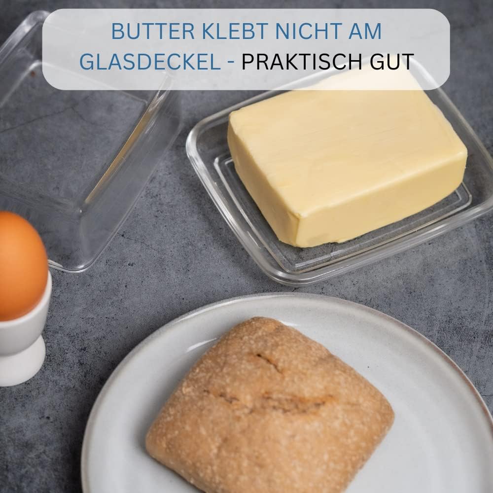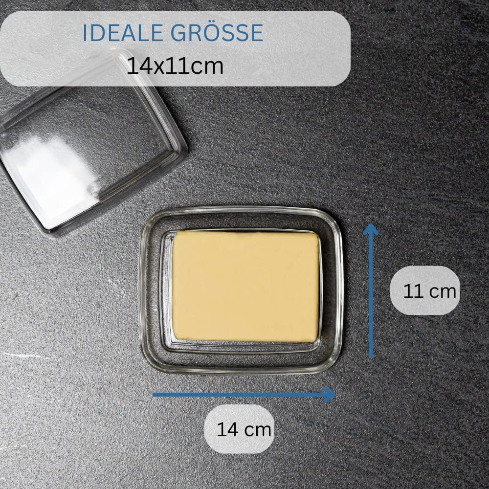 Glass butter dish for storing butter in the fridge, also suitable for serving. Everything at a glance: thanks to the transparent lid, you have a quick overview of the remaining butter, lid with special relief for secure grip. No slipping. High frame ensures that the lid and butter are in place. Easy to clean by hand, dishwasher-safe, BPA-free. Box contents: 1 x Westmark butter dish, dimensions: 14.3 x 11.8 x 5.0 cm. 5 cm, 5 cm cm, Colour: transparent, 20852260