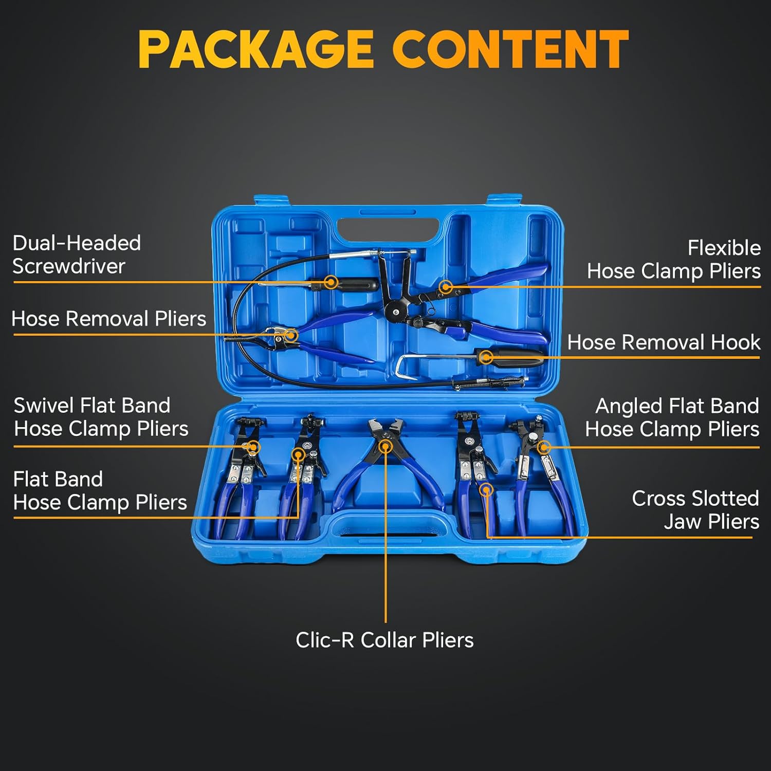 Features: Superior Durability: Made from heat-treated 45# carbon steel, these pliers are built to last, resisting rust and corrosion to ensure long-term reliability for both home and professional use. Ergonomic Comfort: Featuring vinyl plastic mixed insulated handles, these pliers provide a non-slip grip that reduces hand fatigue, allowing for comfortable use during extended projects. Versatile Applications: This 11-piece set is perfect for removing and installing snap rings on a variety of equipment, including lawnmowers, tractors, cars, trucks, and farm machinery, making it a versatile addition to any toolkit. Convenient Storage: The set includes a heavy-duty plastic blow-molded carrying case, ensuring easy transportation, safe storage, and quick organization of all tools, keeping your workspace tidy and efficient. Package Contents: 1 x 5.6" Bend Pliers (Tip Size: 0.054") 1 x 5.6" Bend Pliers (Tip Size: 0.06") 1 x 6" Straight Pliers (Tip Size: 0.058") 1 x 6" Straight Pliers (Tip Size: 0.062") 1 x 7.3" Bend Pliers (Tip Size: 0.074") 1 x 7.7" Straight Pliers (Tip Size: 0.067") 1 x 8.4" Bend Pliers (Tip Size: 0.089") 1 x 9.2" Straight Pliers (Tip Size: 0.087") 1 x 5.5" Hook Tool 1 x 5.5" Pick Tool
