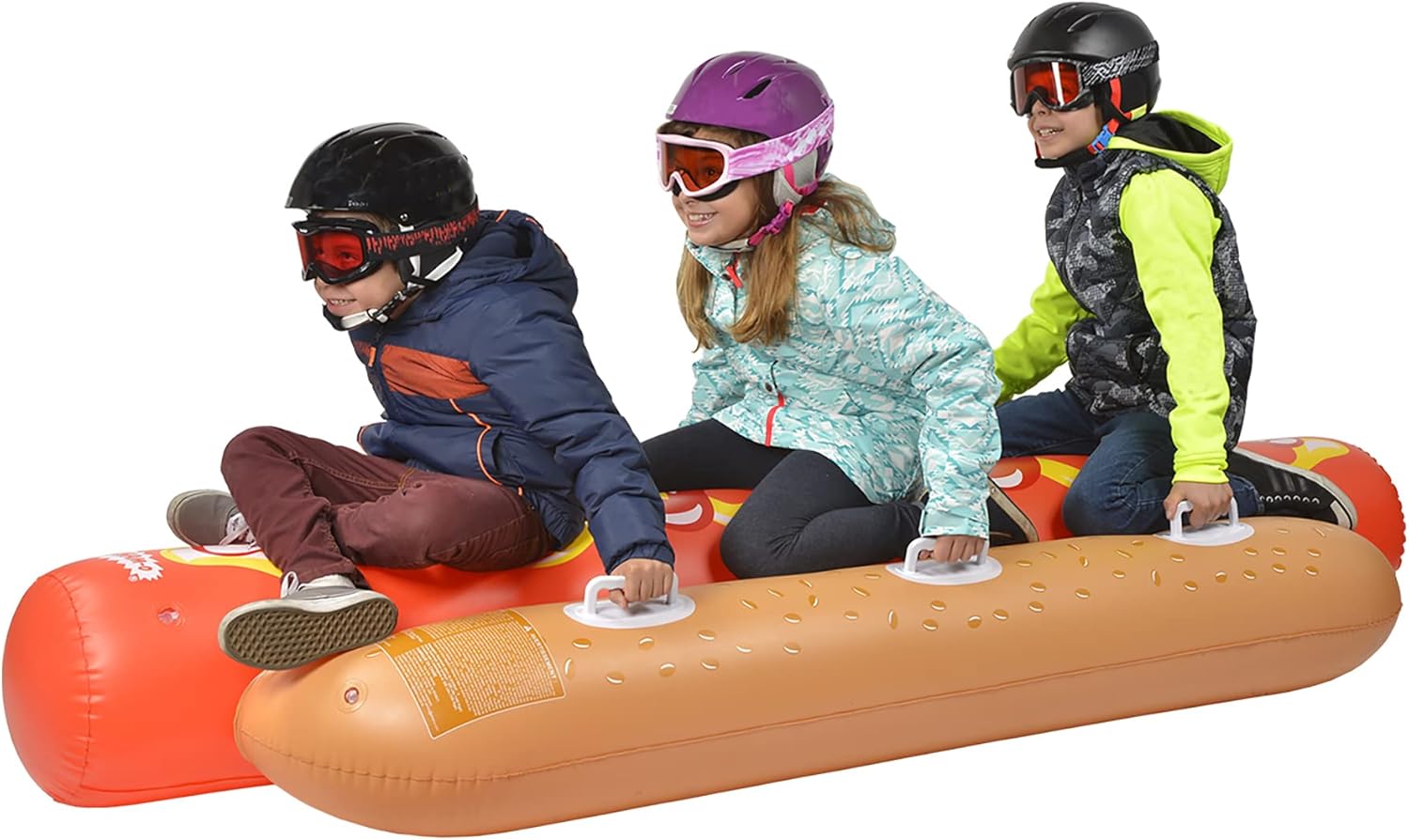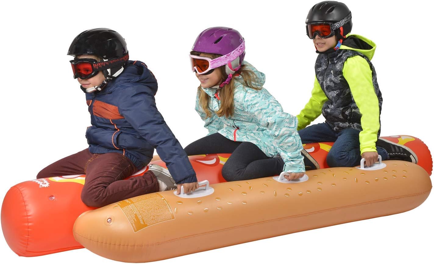 Have you ever wanted to Hot dog it down the hill? The Wham-o Hot Dog Tube is the perfect chance to take yourself and two others down the slopes. The huge 93” length puts the biggest foot long to shame. Made of high gauge PVC vinyl that features cold crack weather resistant formula this tube can with stand all the fixing your can throw at it. The tube features 6 re-enforced plastic handles to easy grip as well as stability. The extra wide 36” width over plenty of stabilization as you slide down the slope. The item is age graded at 4+
