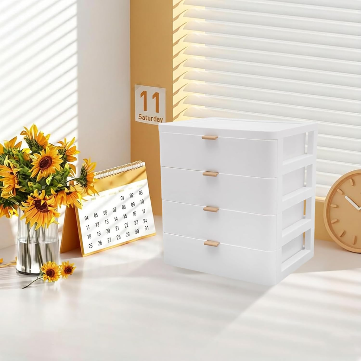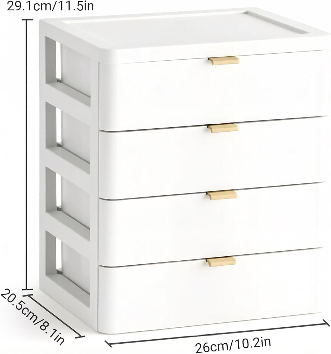 Description: Organize your space efficiently with our sleek 4-tier desk drawer organizer. Designed for your countertop, desk, or shelf, this unit helps declutter your home office, study area, dorm room, or bathroom vanity.The set of four small drawers for your desk is perfect for categorizing and storing a variety of everyday essentials. Use them for makeup supplies, pens and pencils, craft materials, tech accessories, snacks, or personal care items. The generous top can hold a small plant, a photo frame, or frequently used devices, helping you utilize vertical space smartly.We focused on both function and form. The drawers incorporate a thoughtful anti-fallout design, so they stay securely on track even when pulled out completely, giving you peace of mind. The smooth gliding mechanism ensures quiet and easy operation every time.Made from robust and environmentally conscious PP plastic, this organizer is built for durability. Its matte white finish resists fingerprints and blends seamlessly with most room decors, from modern to minimalist. Cleaning is simple-just wipe with a soft, damp cloth.Transform your cluttered surfaces into tidy, productive zones. This versatile plastic drawers unit is the practical and stylish solution for keeping your small items neatly within reach and out of sight. Features:. -Color: White. -Material: Environmentally friendly PP plastic. -Size: 26x20.2x29 cm/10.24x7.95x11.42 inch. Note:Manual measurement, please allow slight errors on size.The colors may exist slight difference due to different screens. Package Including 1 * Desk Top Drawer Organizers