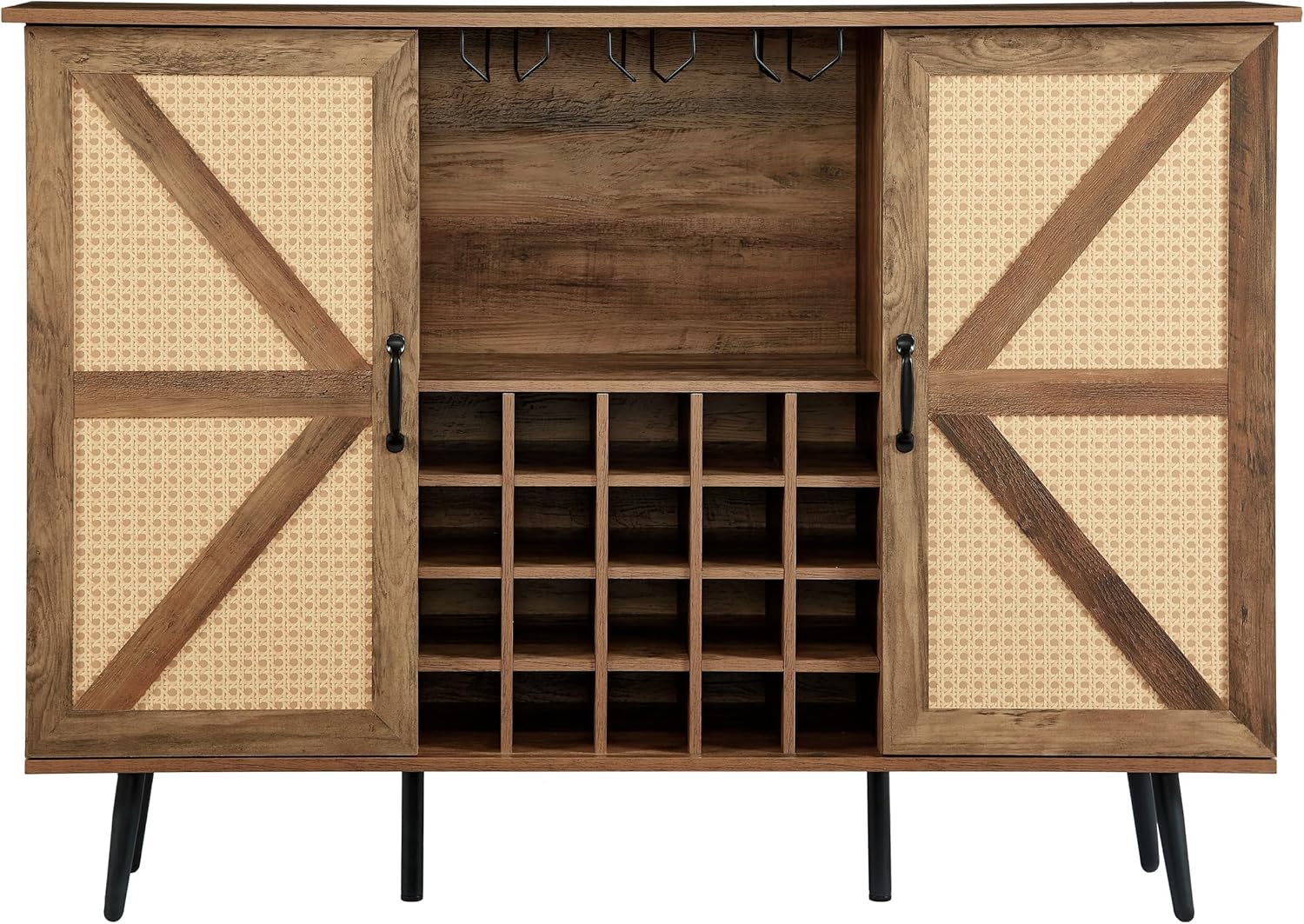 PLENTY OF STORAGE SPACE:This freestanding dining side wine cooler comes with a spacious and sturdy tabletop, a 20-grid wine rack, wine glass holders, and two side cabinets with doors, each with adjustable tiers, providing you with plenty of open and hidden space for storing and displaying your wine, appliances, or personal items! VERSATILE USE: This dining side wine cooler is beautifully designed and also has multiple home uses, not only as a dining room sideboard, but also as a coffee bar cabinet, storage counter, kitchen microwave counter, and even as a TV stand, and so on. In addition, the 6 high quality hardware legs ensure the stability of the wine cooler, so you don't have to worry about your wine collection falling due to instability. STRONG AND DURABLE: This dining side wine cooler is made of high-quality particle board and selected hardware, sturdy and durable, you can use it for a long time without worrying about damage. Featuring a 3D printed rattan-like design, it is environmentally friendly and durable, with a sense of technology and natural beauty. Extra large storage space: 55.1 inches wide x 12.6 inches deep x 38.2 inches high; the top surface can provide extra storage space for plants, picnic baskets and other frequently used items, and can also hold small appliances such as toasters, coffee makers, etc. 20 square compartments wine racks perfectly help you solve the problem of wine placement, and you can display your collection perfectly to your friends while taking into account the practicality. COMPLETE PRODUCT AND EXCELLENT CUSTOMER SERVICE - This freestanding wine cooler comes with detailed instructions and all the parts you need, and it's easy to assemble. You can speak to a customer service agent about any questions you are unsure about!