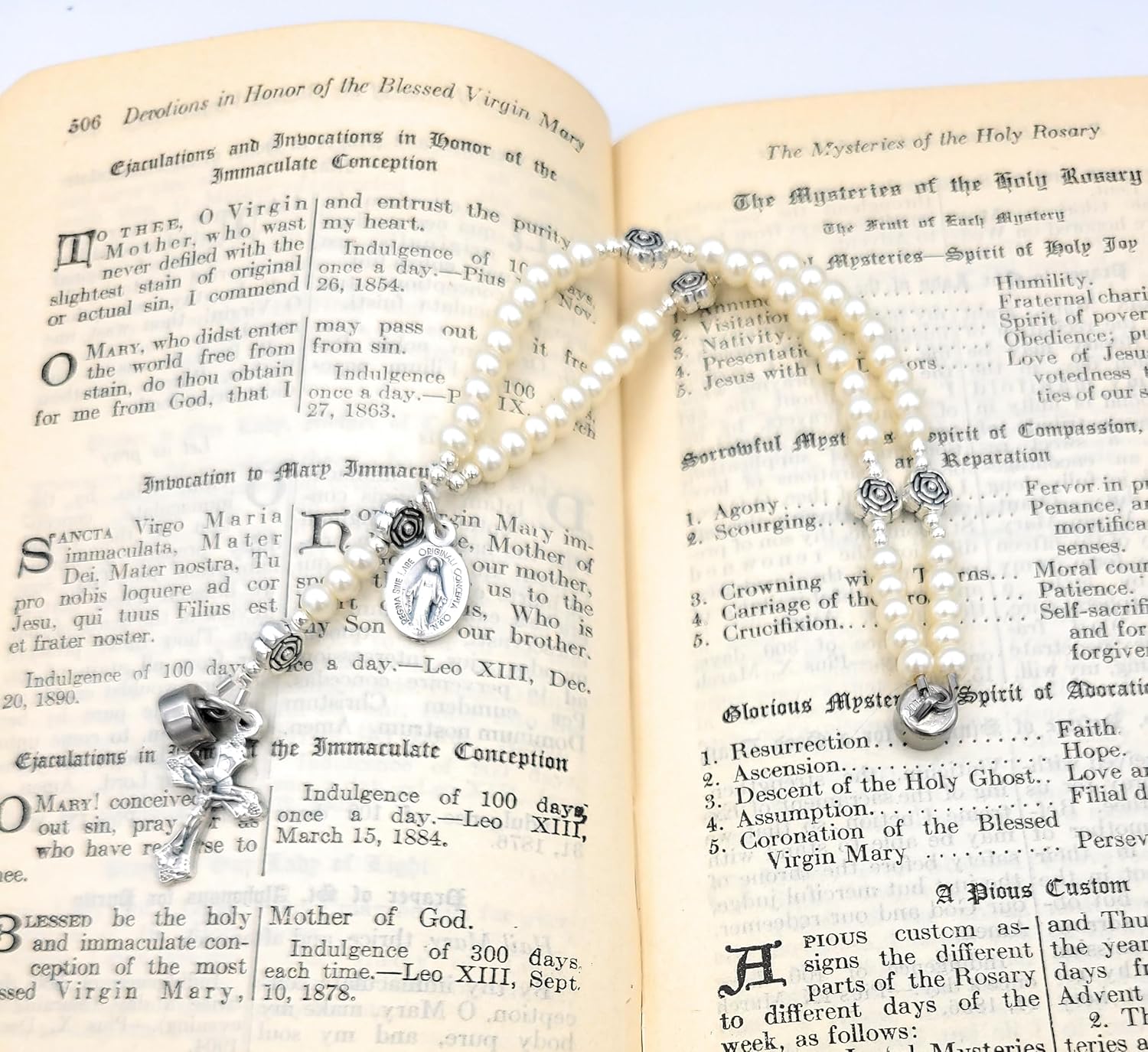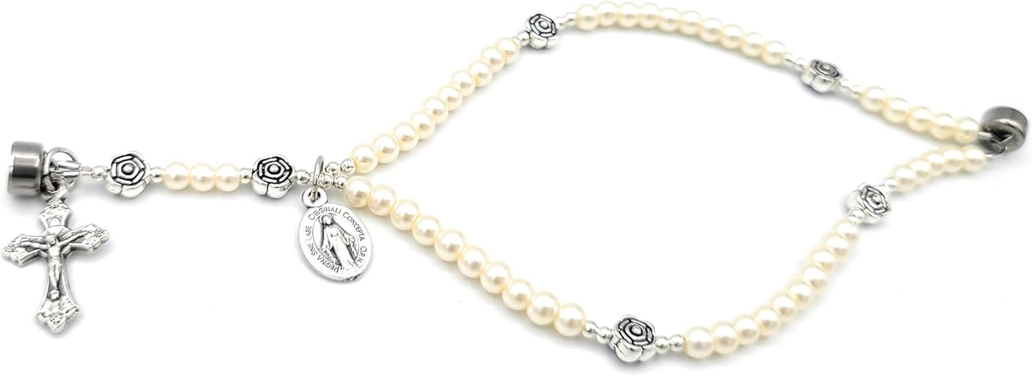 A delicate version of the popular Wrist Rosary by MG Rosary, the original 5 decade rosary bracelet with a magnetic clasp. Made with 4mm Aves and little flower shaped Paters, this classic design will surely enhance your wardrobe and prayer life.