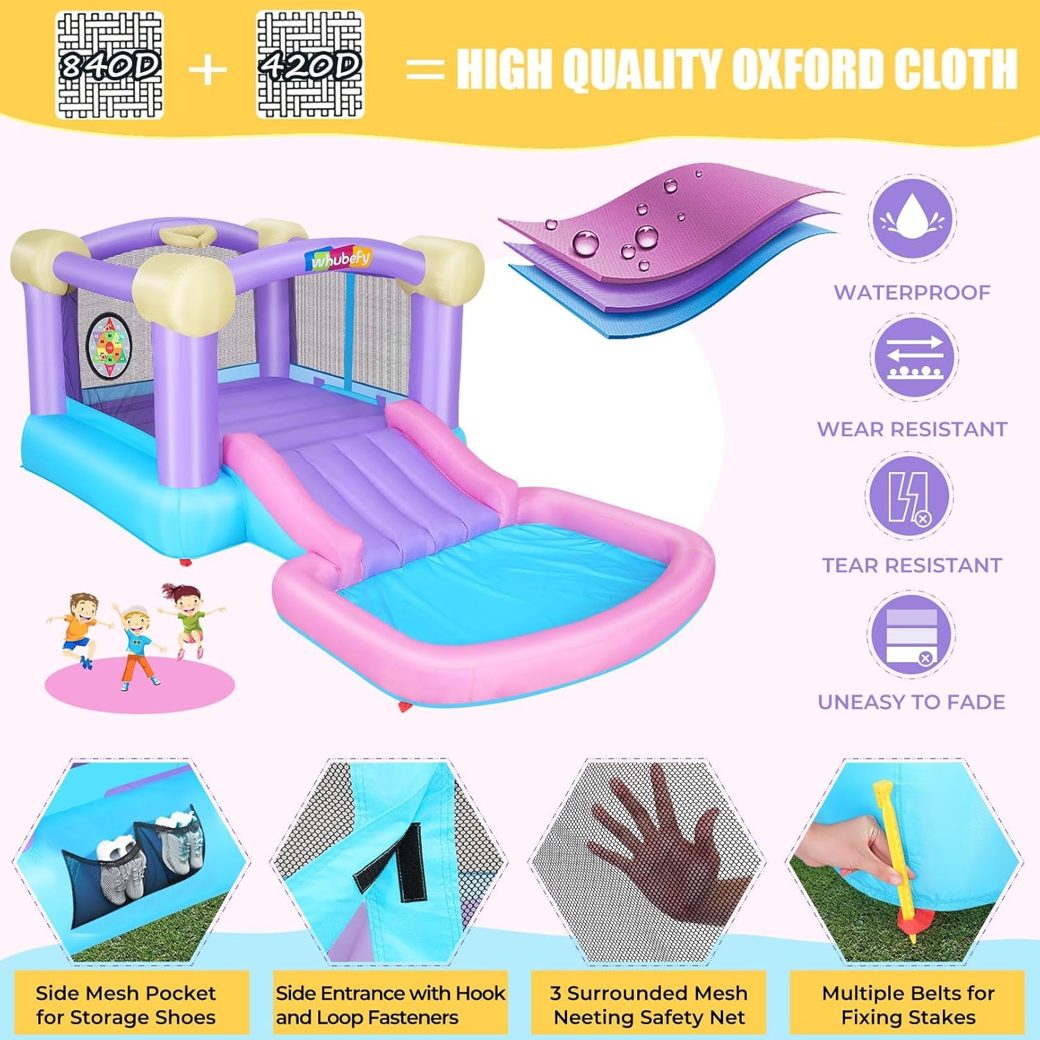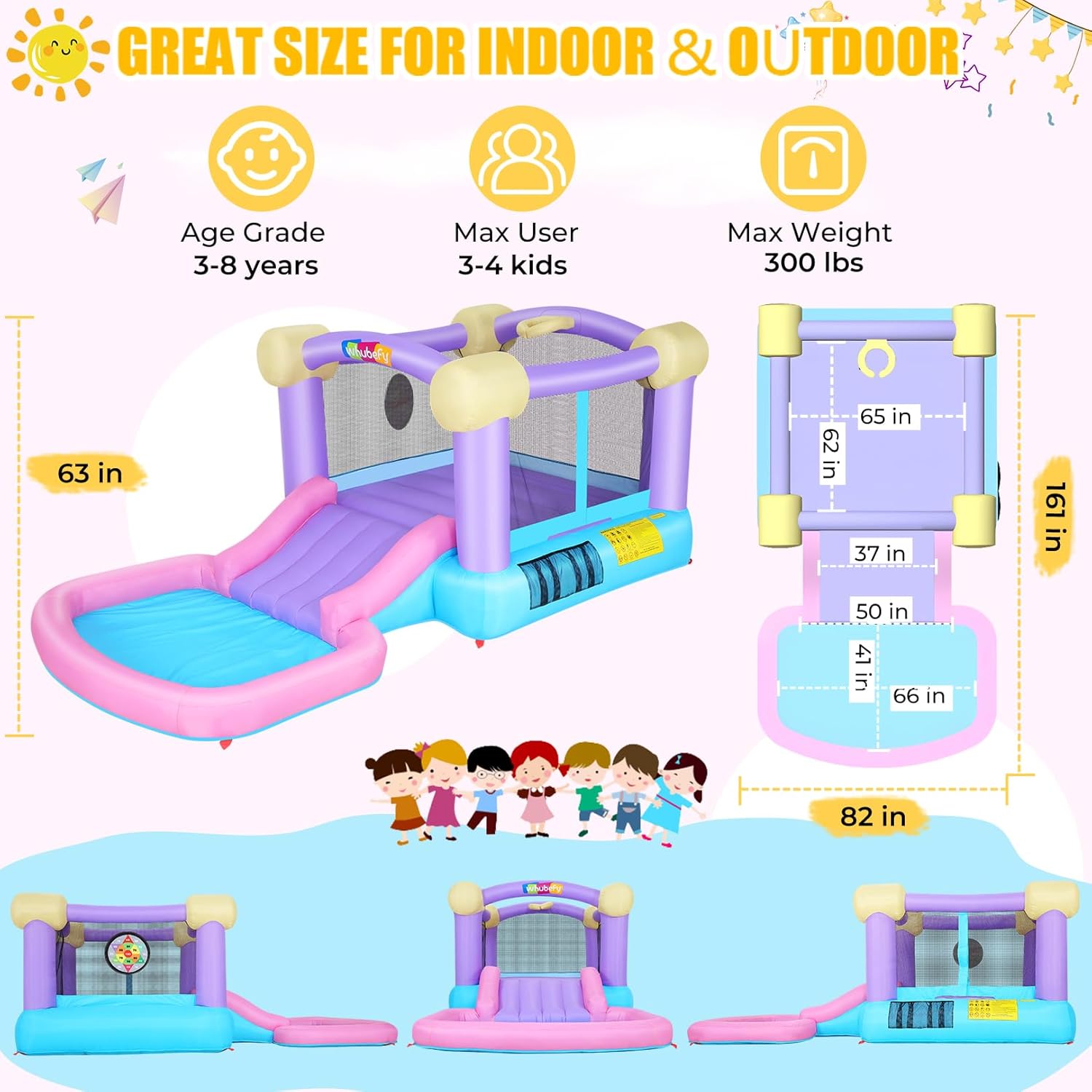 | Included Components | 1 X Bouncer House, 1 X 470W Air blower, 50 X Ocean Balls, 6 X Dart Target Balls, 1 X Inflatable Basketball, 6 X Bouncer stakes, 2 X Blower stakes, 1 X Carring bag, 4 X Repair Patches, 1 X Instruction Manual |