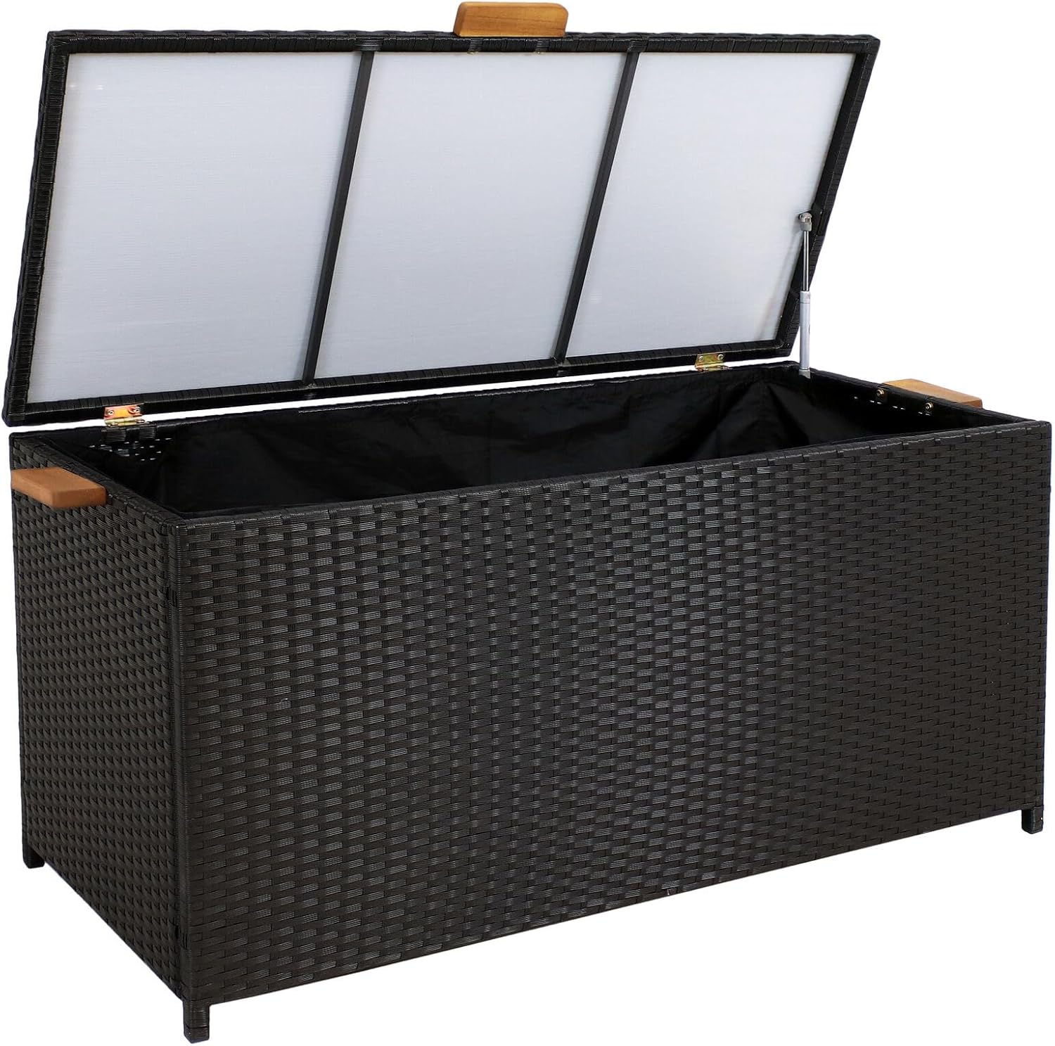 Have a place to store and organize your seasonal recreation, decor, or tool sets with this versatile faux wicker deck storage box. This versatile storage bin can be used both indoors and outdoors and features a convenient hinged lid for easy access to your items. With its resin wicker constructure, this box also has a water-resistant liner to provide additional protection against the elements when in use. It adds traditional style with modern and durable materials as it features a strong steel frame wrapped in strong resin wicker that will stay smooth to the touch and won't splinter or fray. The acacia wood handles also add natural appeal to this stylish patio storage box, sure to bring an extra touch of warmth to any space. This attractive storage solution is perfect for containing outdoor tools, lawn equipment, pool accessories and more. Place on your patio, deck, poolside, or behind the shed for a storage option that is always nearby whenever needed!