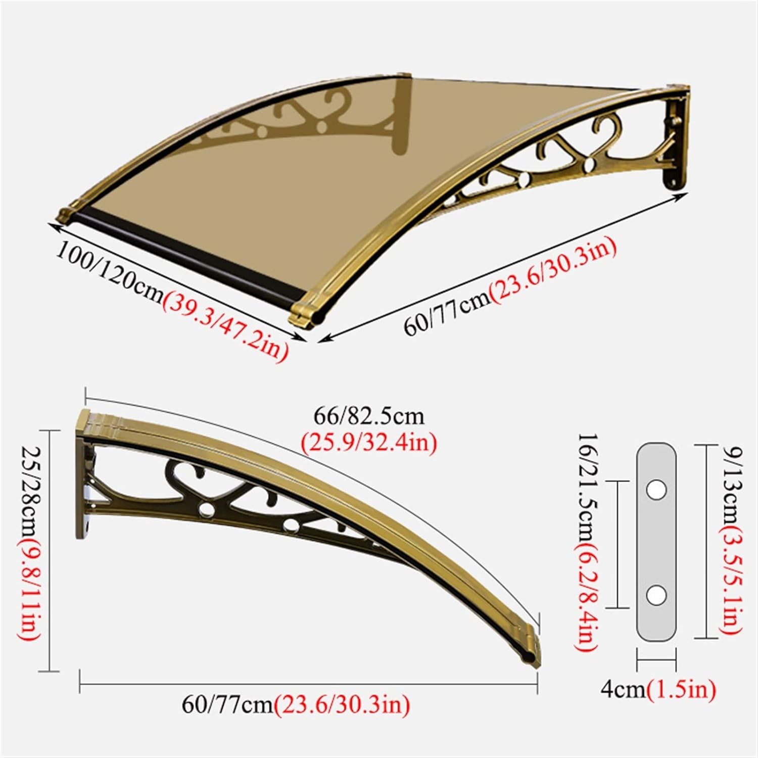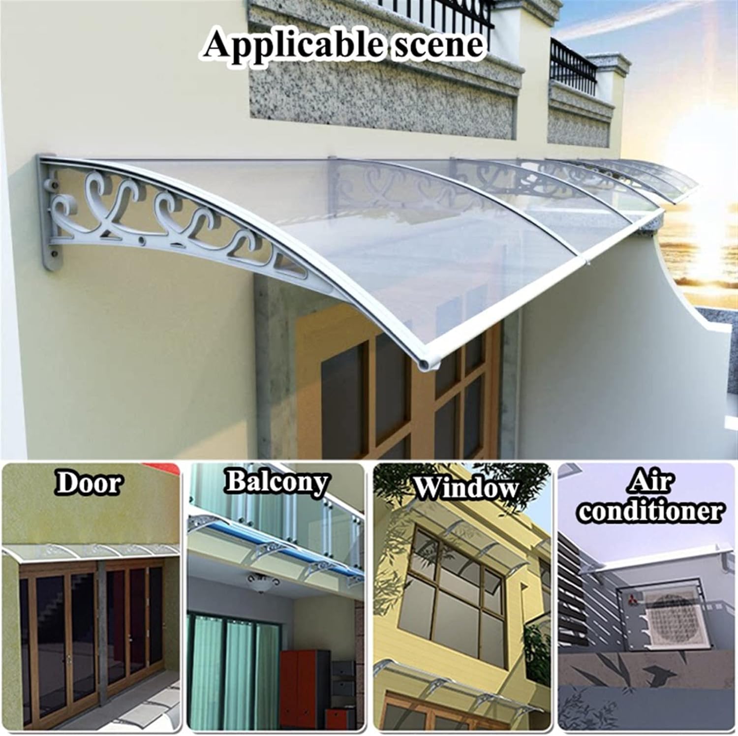 ▼ This elegant canopy makes your entryway a beautiful landscape. It is easy to install above windows, patio doors, shop windows or balconies.▼ Features:- Arc-shaped awning and brackets offer more stability and protection from harsh winds,heavy rain and hail.- Simple design blends in beautifully almost anywhere, can be used with more canopies for a greater coverage area.- The canopy protects your front door from all outdoor weather influences. Steps also stay dry this way and do not become a slipping hazard. - Sound insulation material, silent when it rains, allows you to sleep quietly and clean yourself at the same time.▼ Specification:- Item Name: Door Awning- Material Used: PC, Aluminium-alloy- Suitable outdoor temperature: from about -40 ° C to about 200 ° C- Size(LxWxH):100/120/180/200/300x60/77x16/21.5cm(39.3/47.2/70.8/78.7/118.1x23.6/30.3x6.2/8.4in)▼ Panel Color and Bracket Color:- A: Brown + champagne- B: transparent color + champagne color- C: blue+champagne- D: brown+black- E: transparent color+black- F: blue+black▼ How to choose the right size: - Usually, the installation size of the canopy is longer than the actual door frame size, and the rainproof effect is better. For example, when the actual door frame size is 200cm, the ceiling size that can be selected is 240cm.▼ Package Contents:- 1 x door canopy/2 x door canopy/3 x door canopy▼ Notice:1. Before placing an order, please measure your window or door size before making a decision.2. Because manual measurement may have an error of 1-3mm, there may be color differences due to the display of the display.