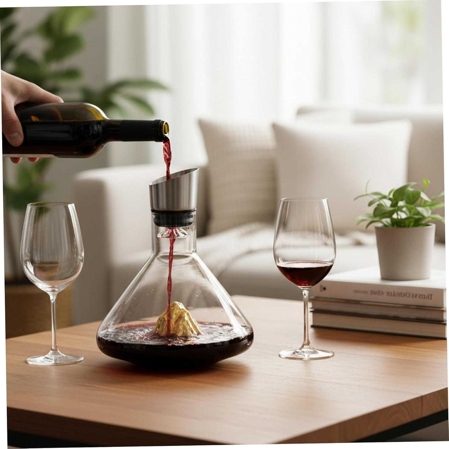 Description: This 1500ml Gold Mountain Wine Decanter with Aerator is meticulously crafted from lead-free crystal glass to promise purity and ensure safe enjoyment of your favorite wines. Its spacious capacity is designed to handle an entire bottle, facilitating optimal aeration that enhances the depth and complexity of flavors, particularly in red wines. The integrated aerator technology accelerates oxygen exposure, softening harsh tannins and releasing rich aromas for a more refined tasting experience. Perfect for both casual and formal occasions, this decanter not only improves the wine's bouquet but also adds an elegant touch to your table setting. Easy to use and clean, it appeals both to seasoned wine enthusiasts and novices alike, making it an excellent favor or a practical addition to your wine accessories. Whether used for celebrations or quiet evenings, this decanter elevates every pour, combining aesthetic beauty with premium performance for enhanced wine enjoyment. Features:. Wine Decanter. -Color: Clear. -Material: Glass. -Size: about 21.5*18*6.2cm/8.5*7.1*2.4inch. Note:Manual measurement, please allow slight errors on size.The colors may exist slight difference due to different screens. Package Including 1 x Wine Decanter