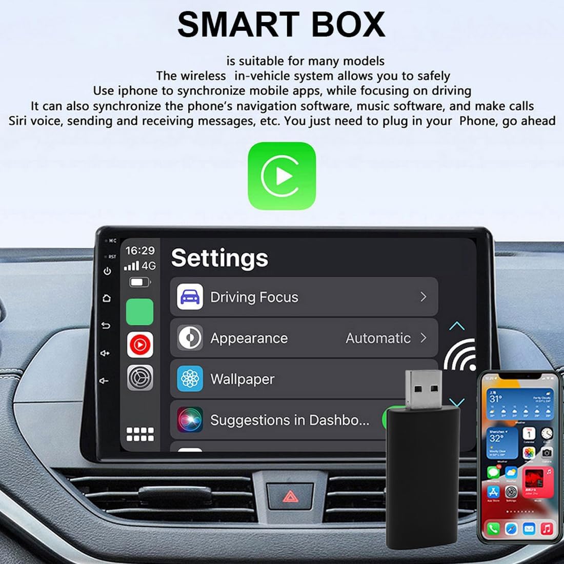 Product Name: carplay Car USB AI BOX Power Consumption:3-5W Connection: Wireless Power Input: 5V 1~2.1A Power Output: DC5V 1~2.1A Car models: original car with wired carplay models Supported cell phone: ios10.0 and above system of the Phone