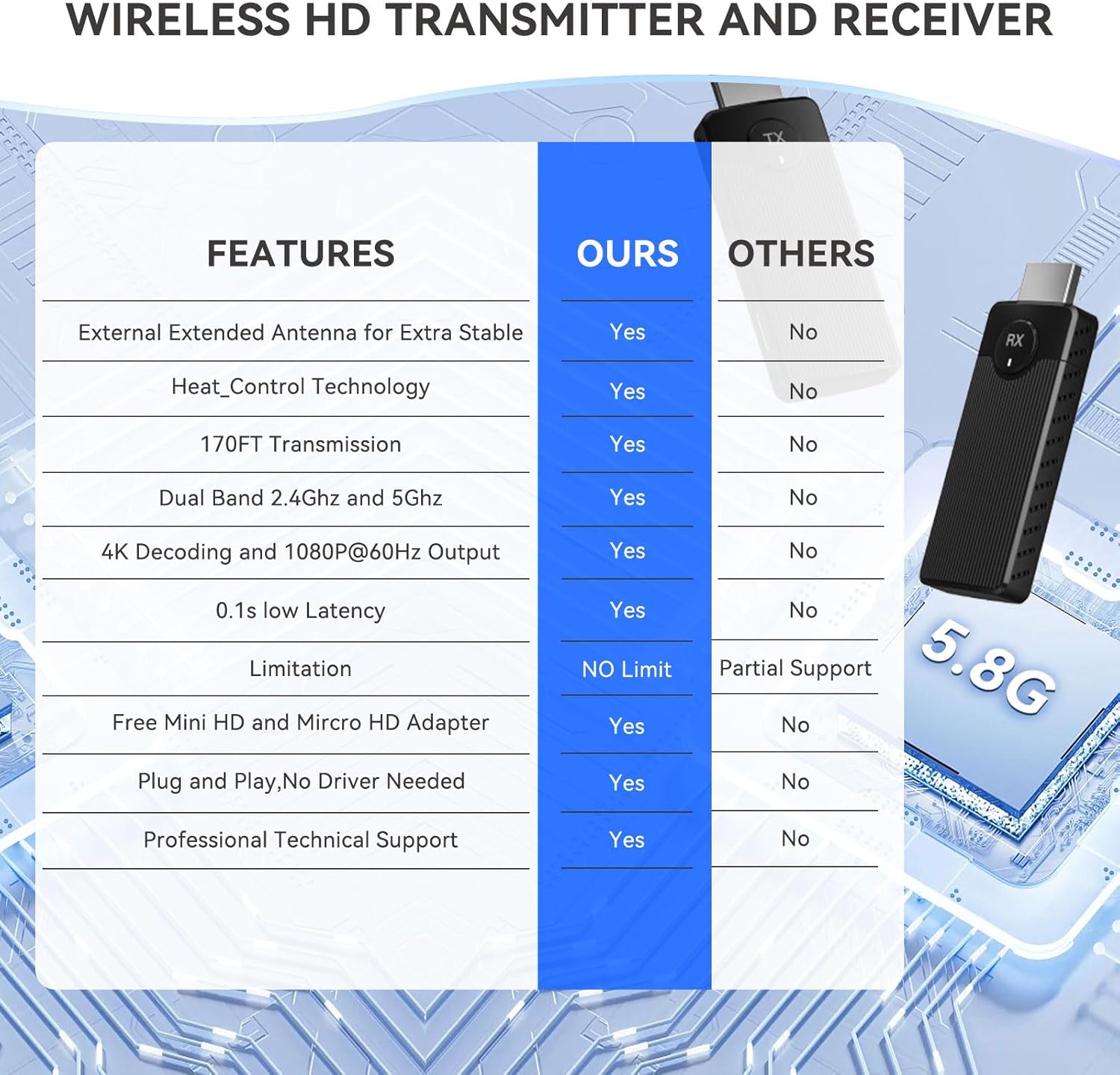 Anycast Wireless HD Display Dongle Adapter Wireless HD Transmitter and Receiver Kit 4K 2.4G 5GHz Screen Mirror and Screen Extender Streaming Video Audio Media from Laptop PC DSLR PS3/4 to TV Projector Monitor Display