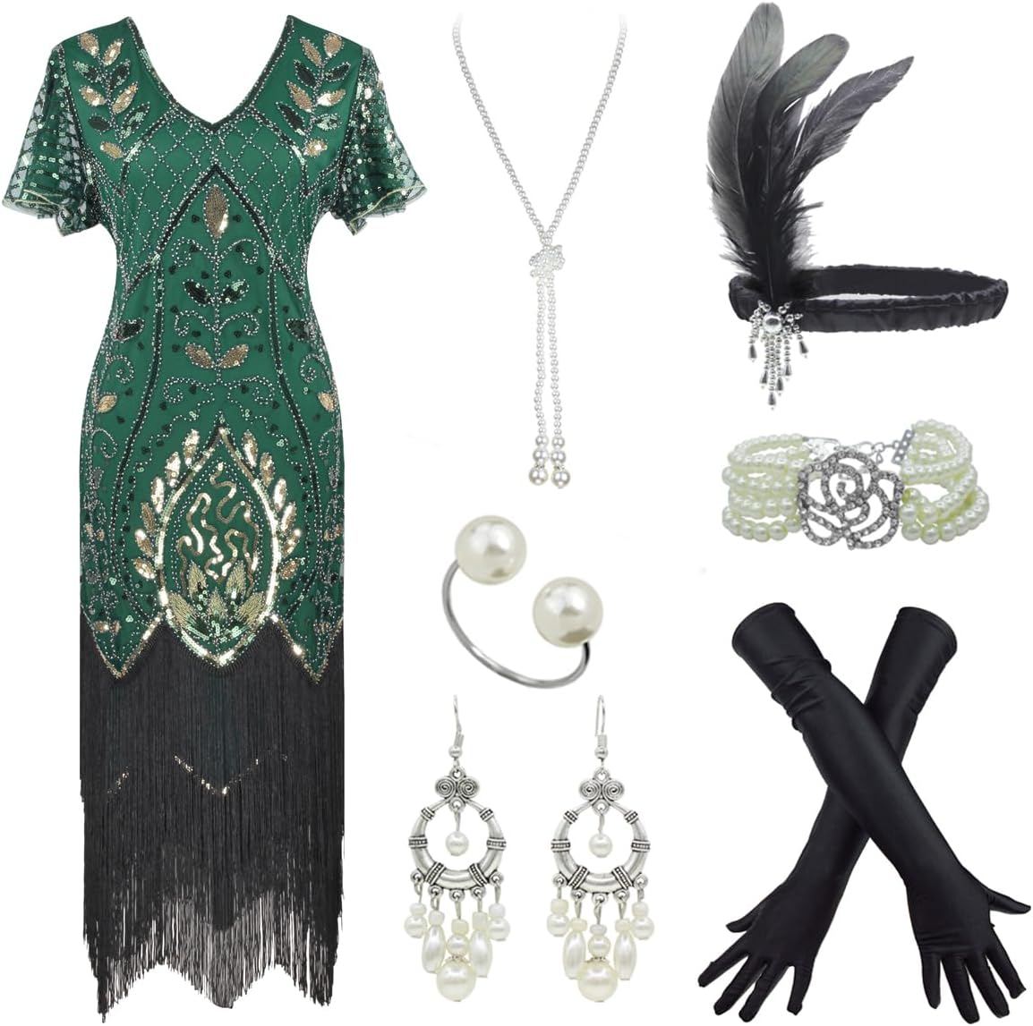 • Package:1 x Sequin Dress, 1 x Cigarette Holder, 1 x Long Satin Glove, 1 x Feather Headband, 1 x Pearl Necklace, 1 x Earring, 1 x Pearl Bracelet.