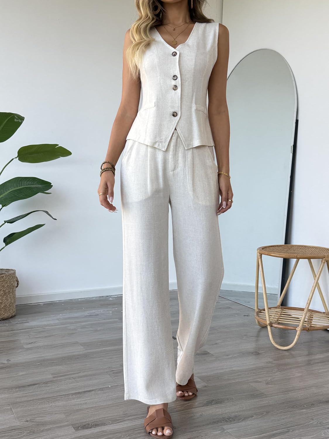Womens Vest Sets 2 Piece Outfits Sleeveless Blazer Waistcoat and Dress Pants Suits Dressy Casual Cotton Linen Blend Wear Petite Short Tall Long Length