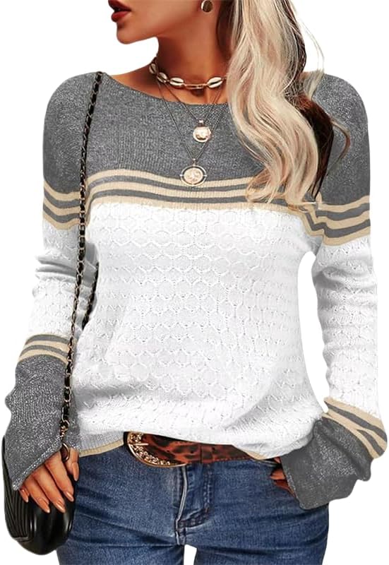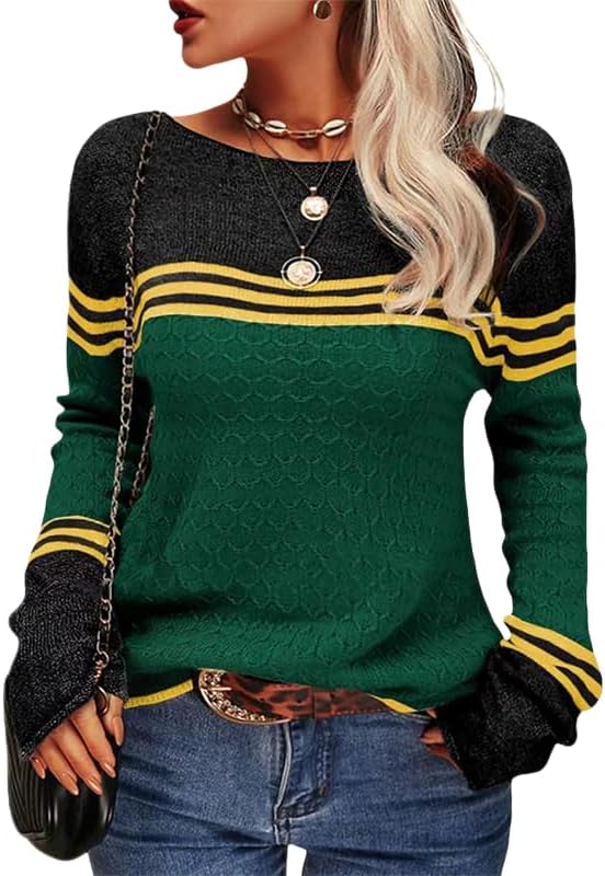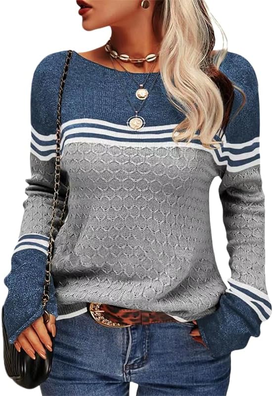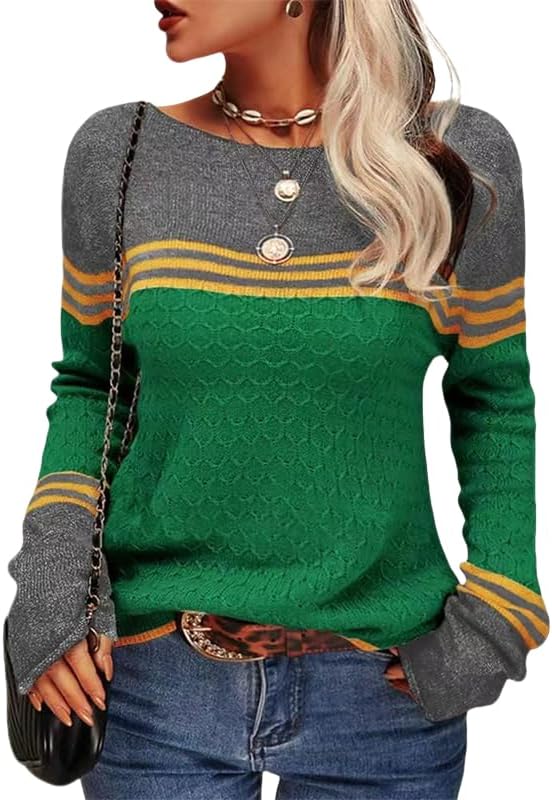 Cobiako Women's Color Block Striped Sweaters Long Sleeve Boat Neck Casual Lightweight Knit Crewneck Pullover Sweater