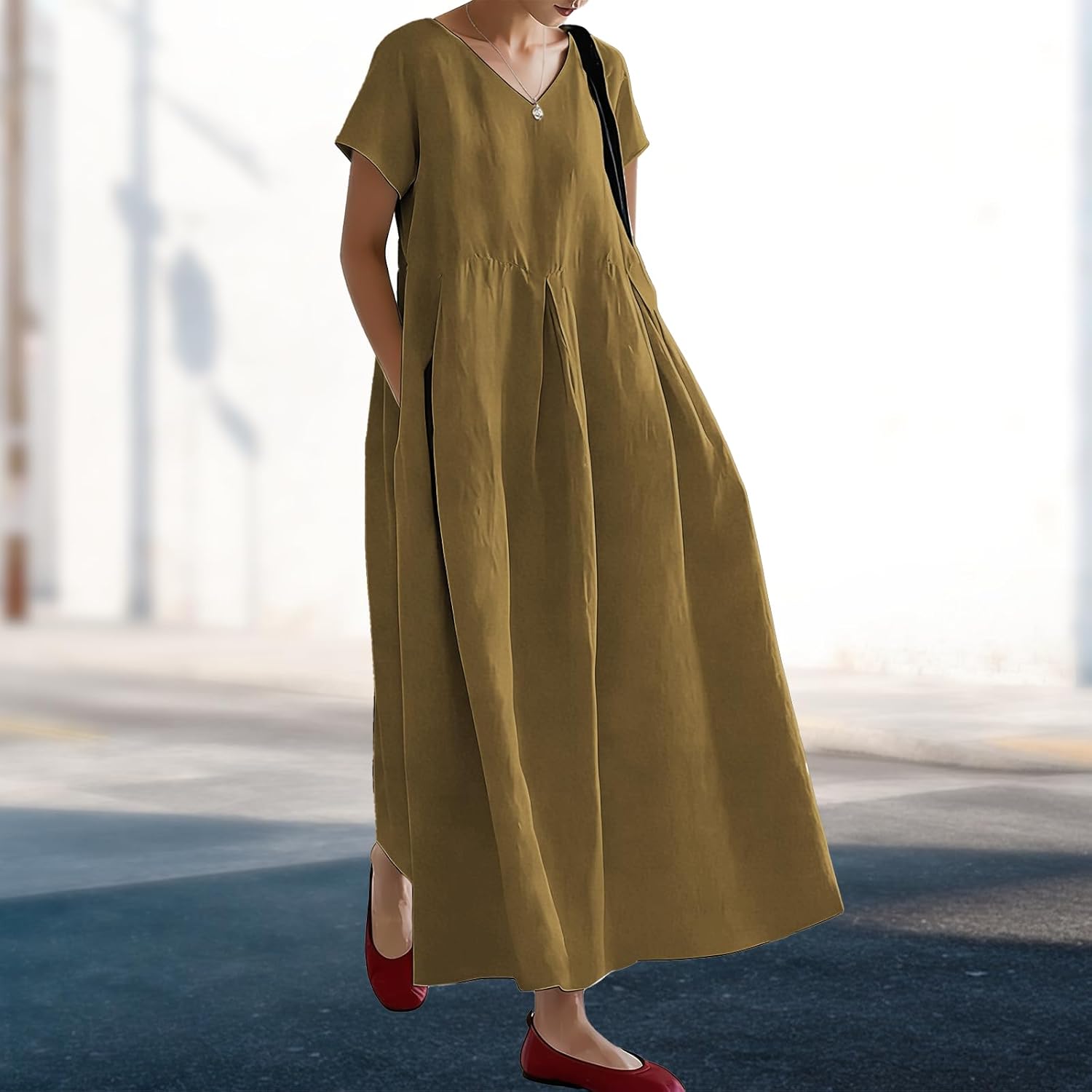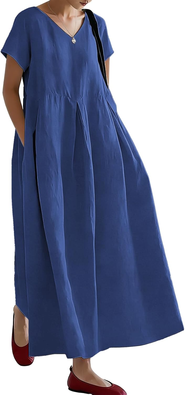 Biacolum Womens Summer Maxi Dress Lightweight Solid Color V Neck Short Sleeve Flowy Casual Vacation Dresses with Pocket