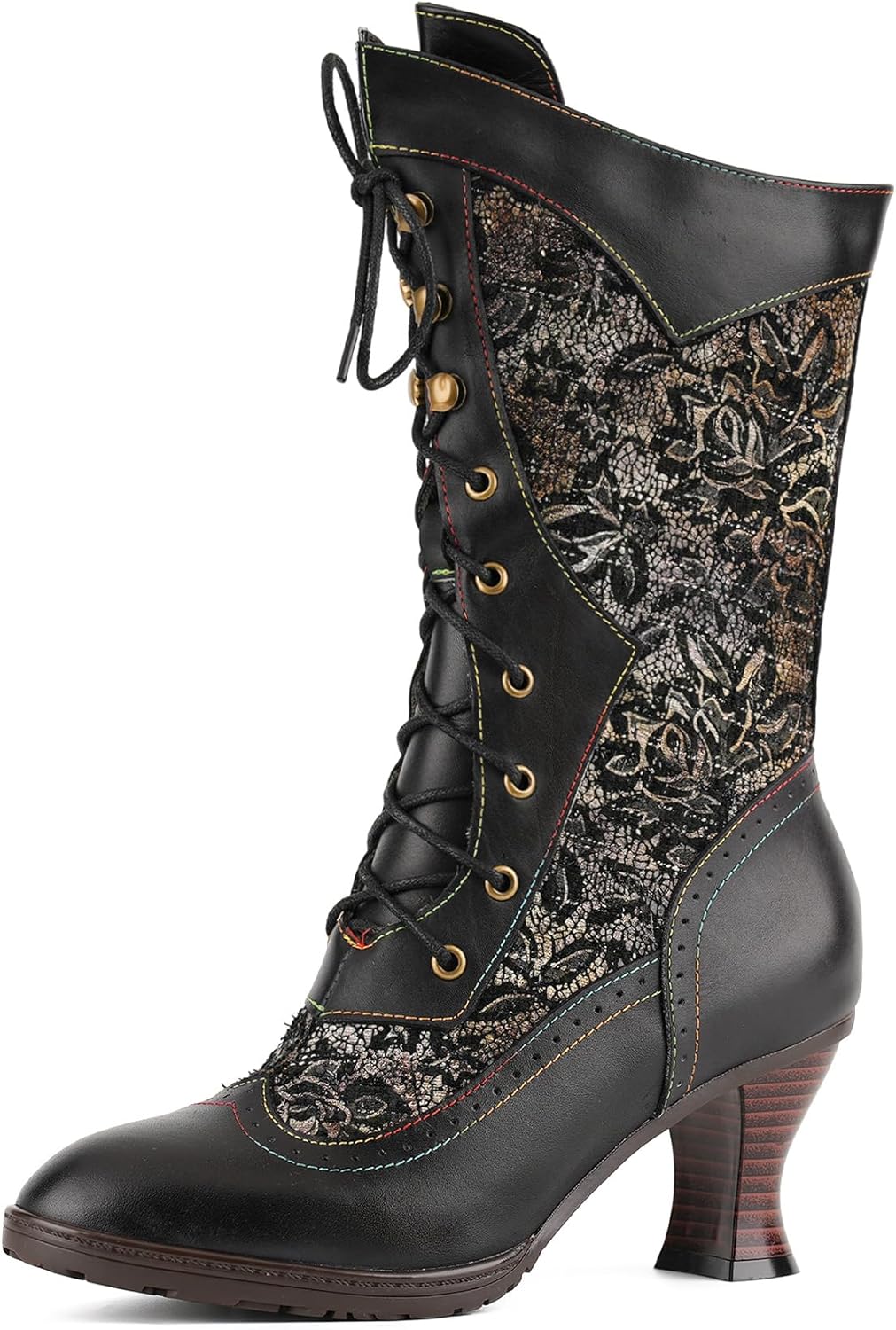 Women's Victorian Mid-Calf Boots, Winter Warm Plush Lined Steampunk Brocade Booties, Retro Rainbow Stitched Wingtip Brogue Shoes with Sculpted Flared Heel