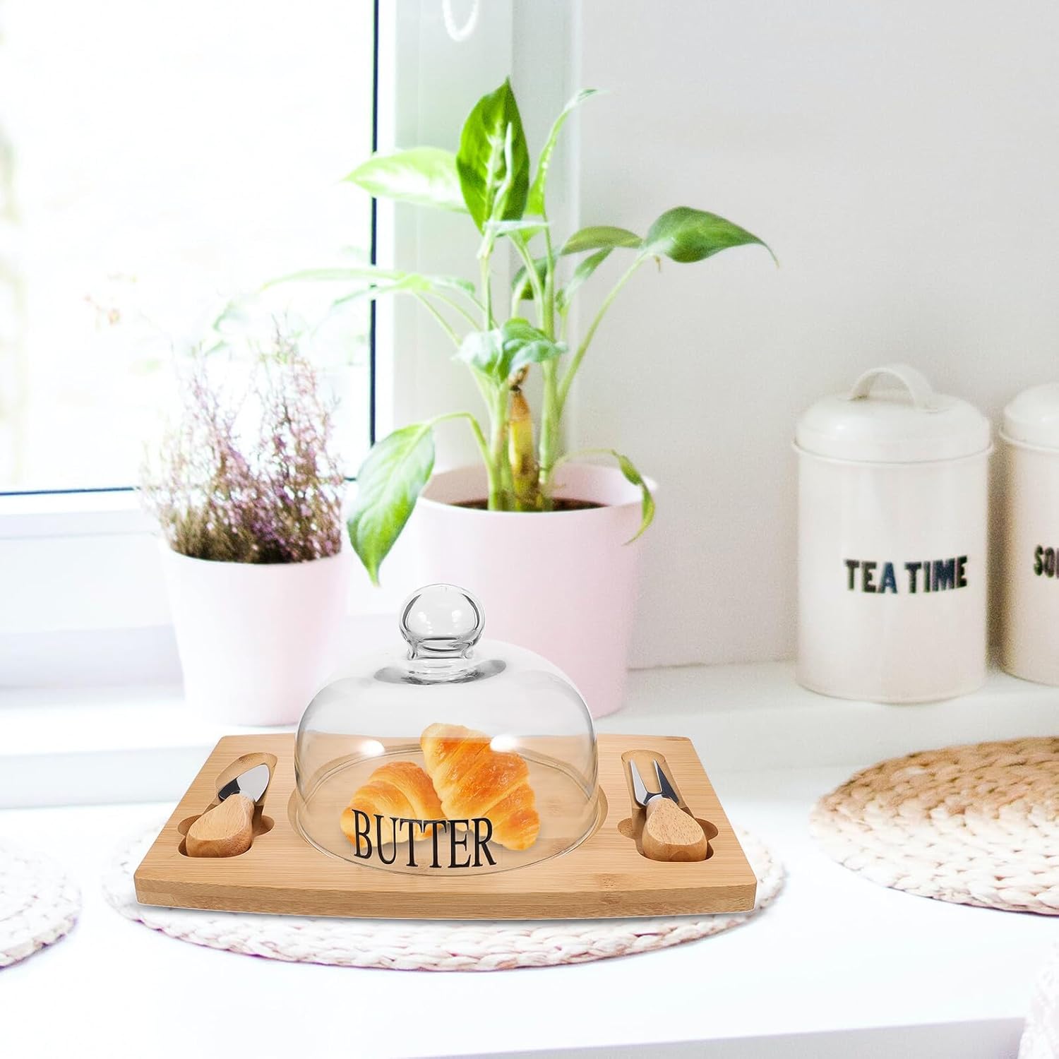 Package List 1 x wood tray*with dome) 1 x cutter 1 x fork Characteristics - Size: 28.50X19.50X1.30cm/11.20X7.66X0.51in -Product Info:Butter box -Material:Wood, glass - Made from wood, glass materials, this container is both and easy to clean, making it a great addition to any kitchen. - This versatile kitchen butter box is a must-have for any home, as it can be used for a variety of purposes butter plate. - ColorAssorted Color - The sealed design of this container that food stays fresh and prevents any unwanted odors from spreading throughout your kitchen butter dish. - The storage container not only saves space, but also makes it easy to store in any kitchen butter dishes with lids. - With a spatula, this container makes it easy to cut through butter, cheese, and other foods without having to use a separate utensil butter container.Goods Descriptionbutter keeper dish Saves space and makes it easy to store.butter plate The included butter spreader is good for cutting butter, cheese, and other foods.covered butter dish The sealed design keeps food fresh and prevents odors from spreading.wood butter dish The Butter Box is a must-have for any kitchen
