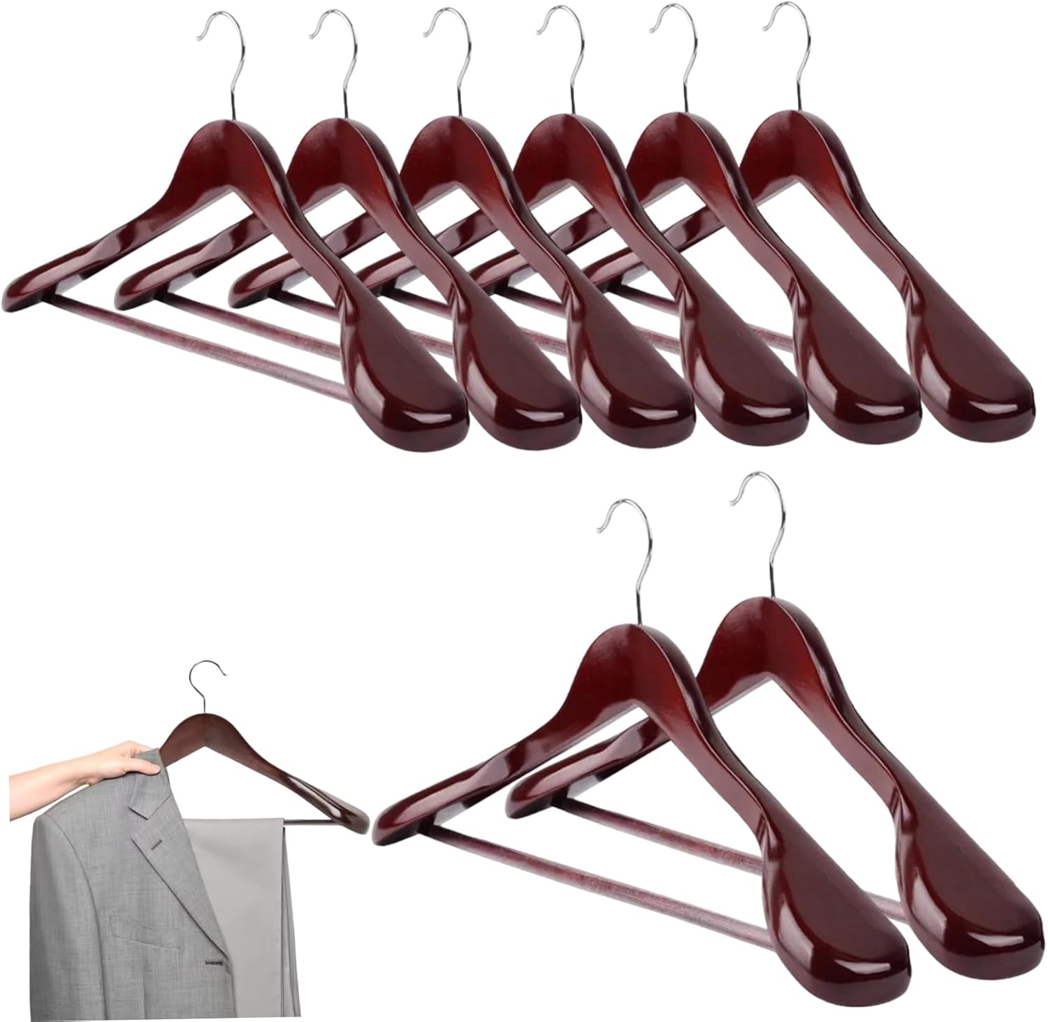 Description: This set of 8 wooden hangers combines strength, elegance, and practicality in one package. Measuring 17.5x10 inches, each hanger supports heavy clothing like jeans, suits, coats, and pants with ease thanks to their robust construction. The wide shoulder design preserves the natural shape of garments, preventing stretching or damage, while the rich red-brown finish adds a classy look to your closet. These hangers are versatile enough for various uses, whether organizing a home wardrobe, outfitting a retail display, or managing professional attire. Their slim yet sturdy profile helps maximize closet space without sacrificing durability, making them an essential addition for anyone who values both function and style in clothing care. Features:. Wooden Hangers. -Color: Red Brown. -Material: Wood. -Size: about 44.5x26cm/17.52x10.24inch. Note:Manual measurement, please allow slight errors on size.The colors may exist slight difference due to different screens. Package Including 8 x Wooden Hangers.