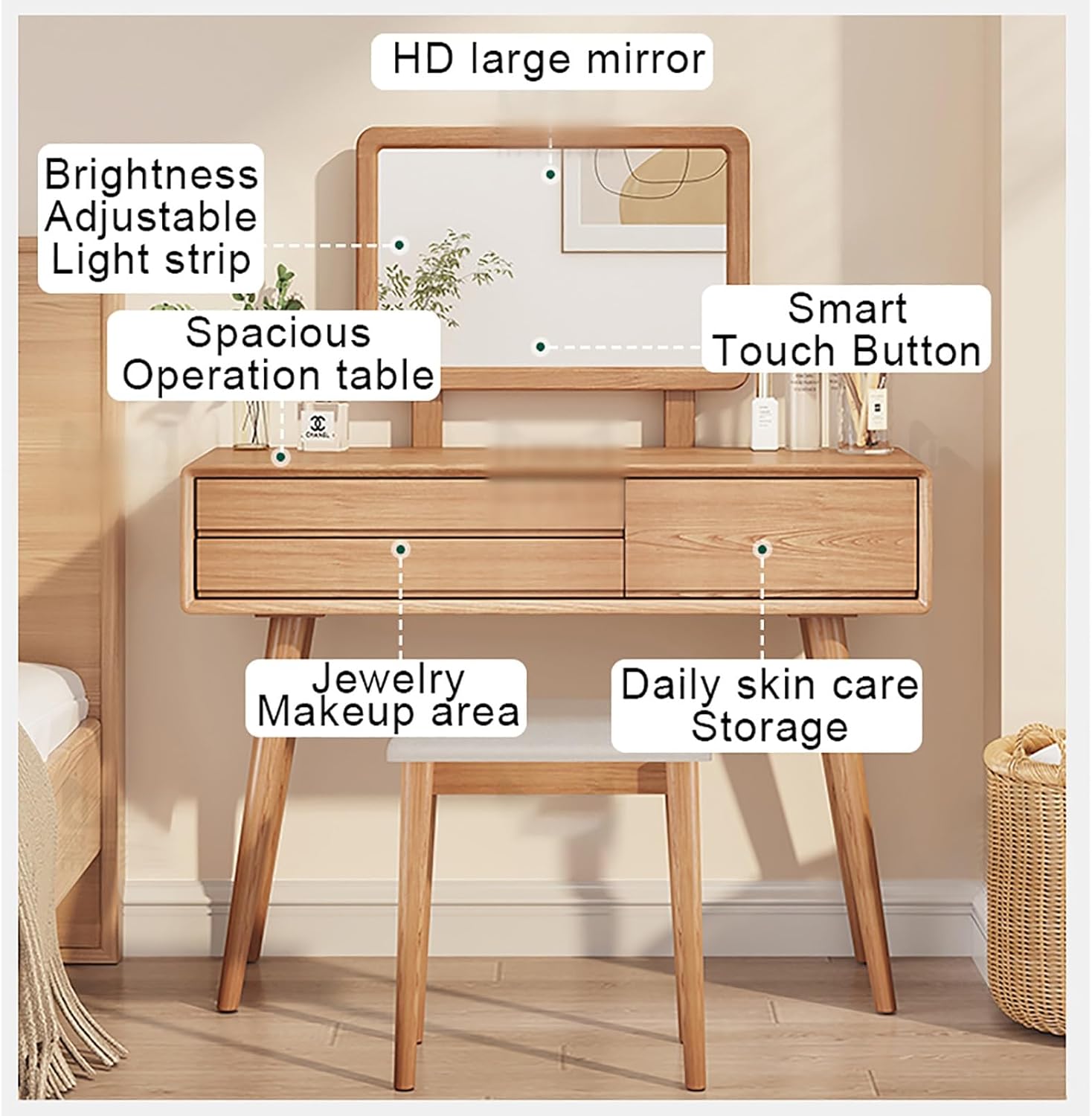 Wooden Makeup Desk for Bedroom Dressing Room Dressing Table with Mirror Vanity Table Set Wooden Makeup Desk with Stool Modern Dressing Table Elegant and Modern DesignOur vanity table set features a sleek and modern design that adds a touch of sophistication to any room. The clean lines and elegant wood finish make it a versatile piece that complements a variety of décor styles. Whether you place it in your bedroom, makeup room, or dressing room, this wooden makeup desk will enhance the aesthetic appeal of your space.Spacious and OrganizedKeep all your beauty essentials neatly organized with our dressing table’s ample storage options. The desk is equipped with multiple drawers and compartments, providing plenty of space to store your cosmetics, jewelry, and other accessories. The spacious desktop offers enough room to display your favorite beauty products and decorative items, ensuring everything you need is within easy reach.High-Quality ConstructionCrafted from high-quality wood, this vanity table set is built to last. The sturdy construction ensures stability and durability, so you can enjoy a reliable and long-lasting piece of furniture. The included stool is not only stylish but also comfortable, providing you with a cozy seat during your grooming sessions.Easy Assembly and MaintenanceOur vanity table set is designed for easy assembly, with all necessary hardware and detailed instructions included. The smooth surface of the desk and mirror is easy to clean, ensuring your vanity area remains pristine with minimal effort. Enjoy a hassle-free setup and a beautiful, low-maintenance piece of furniture that will serve you for years to come.Versatile FunctionalityThis wooden makeup desk is not just for makeup. Its versatile design allows it to function as a regular desk for your bedroom or dressing room. The adjustable mirror can be positioned to your preferred angle, making it perfect for apply