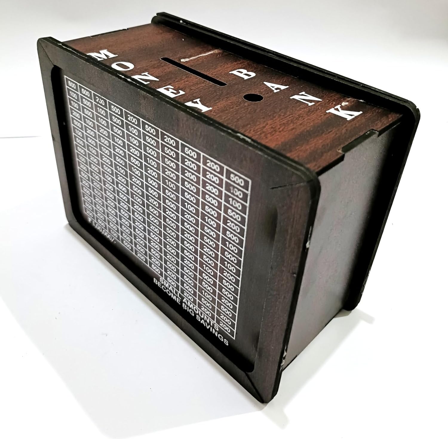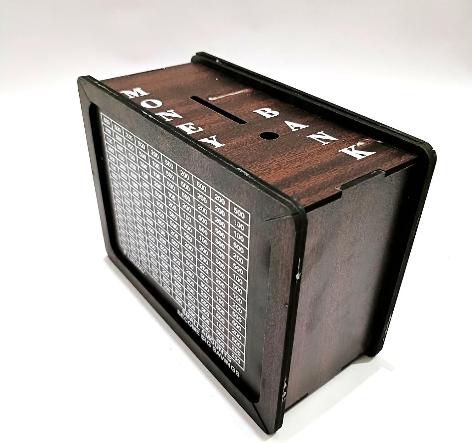 • DESIGN: Stylish dark brown wooden money bank box with built-in savings chart, perfect for teaching financial responsibility and tracking savings progress