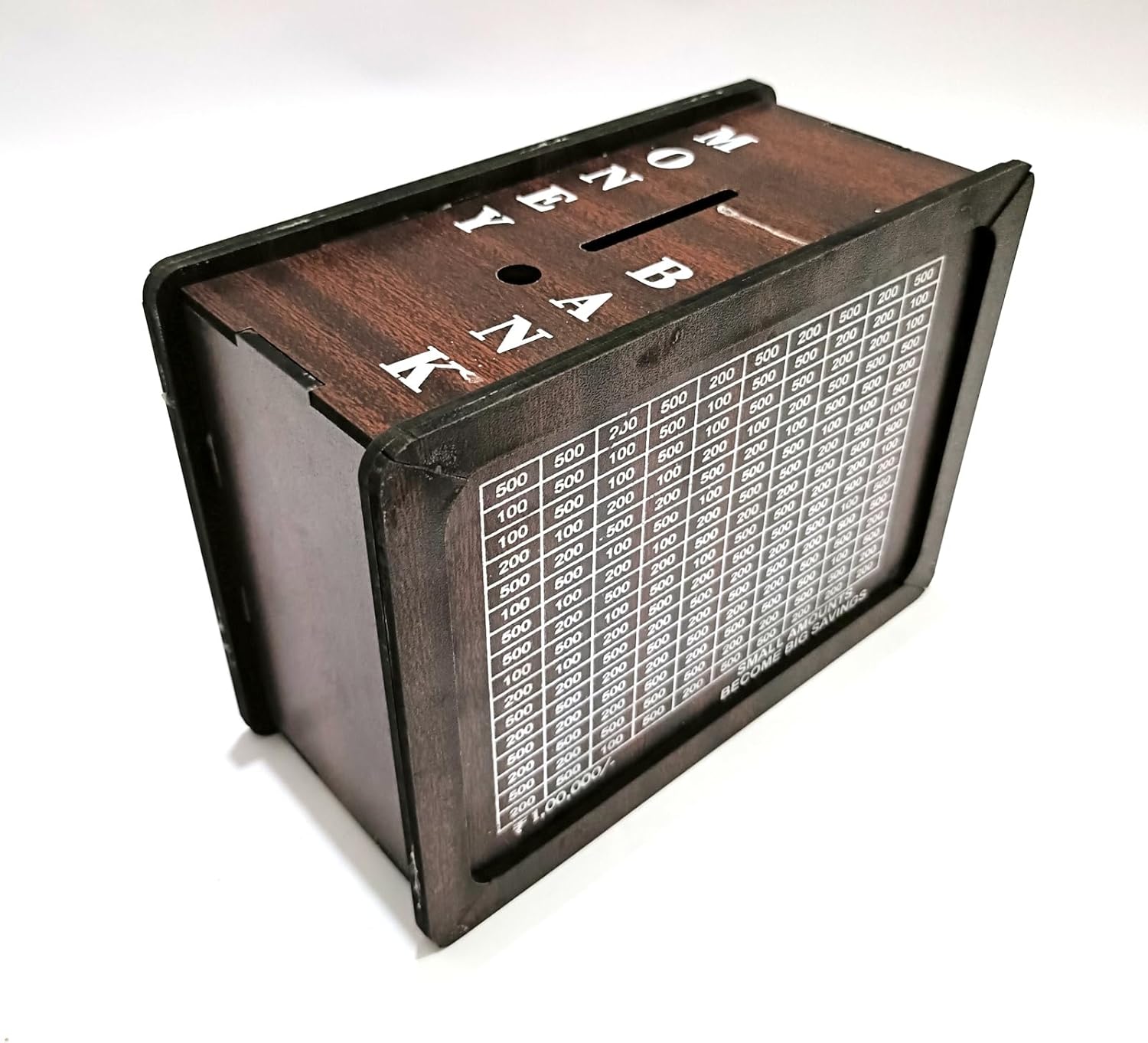 Wooden Money Bank Box with Savings Chart, Dark Brown, Decorative Piggy Bank