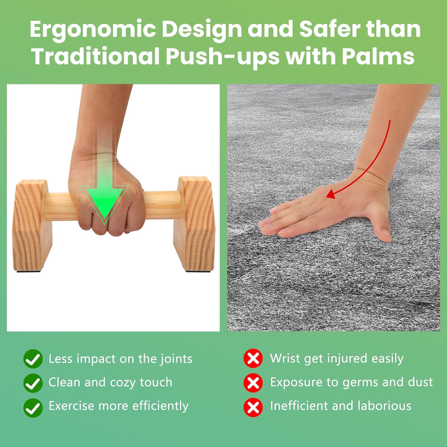 1.Material: Pine 2. Features: 1)The straight wrist of the parallel bars can increase the torque. 2)Short stand reduces strength consumption. 3)Strong and durable 4)For fitness, the triangle pivot is more stable 5)25CM models can bear weight about 150KG 3. Product size (Approx.): Length 25CM/9.84inch, width 14.5CM/5.7inch, high 11CM/4.33inch Package includes: 1 Pair of Handstand Bars