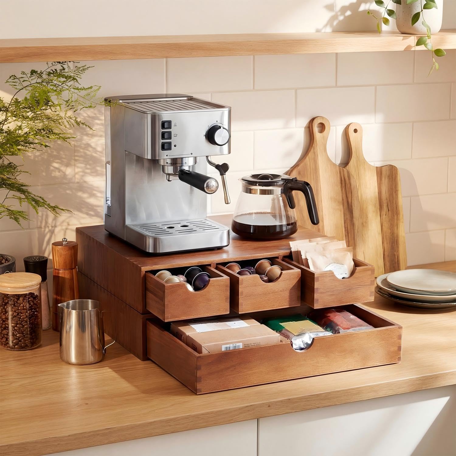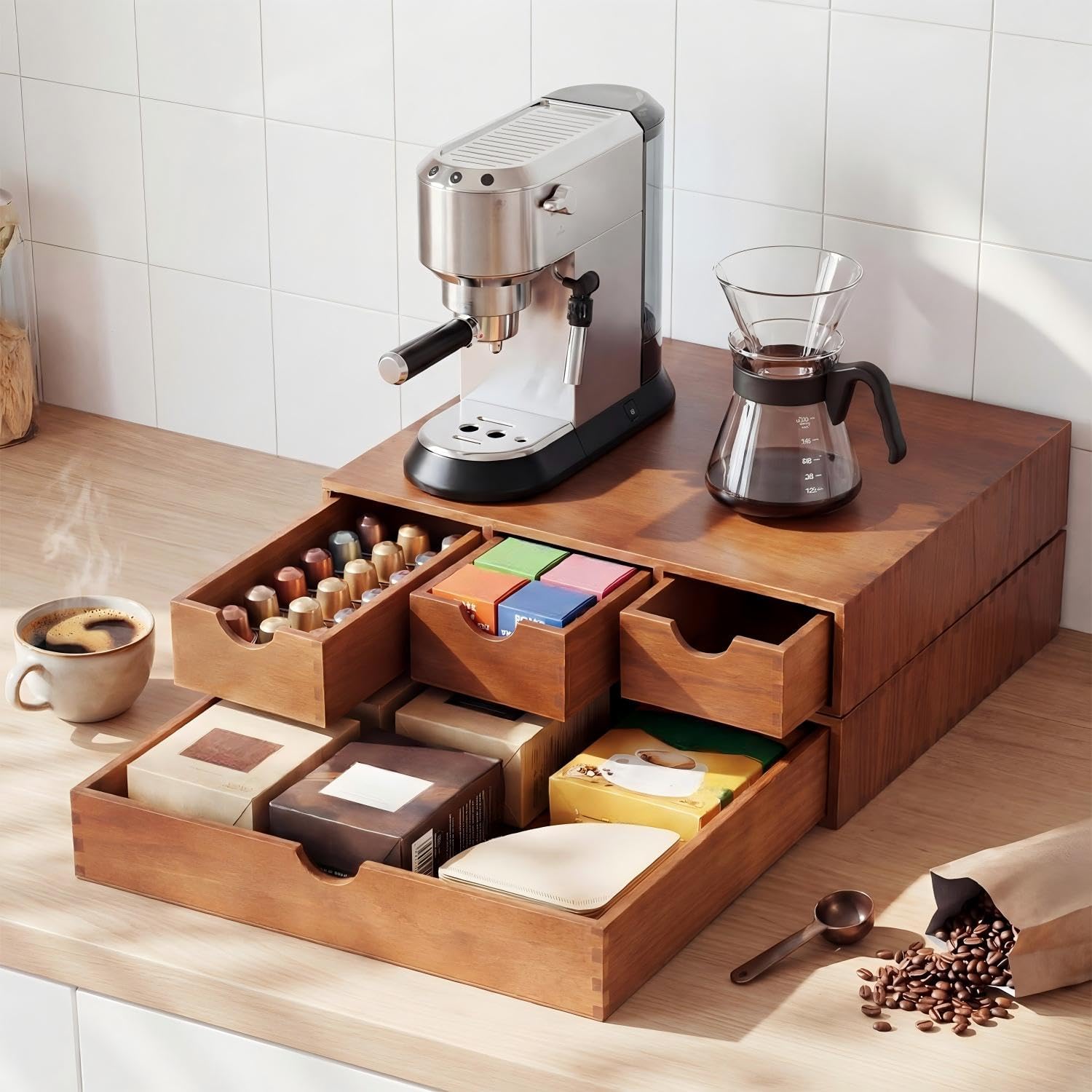 Features: No installation required: This 2 layer organizer requires no assembly upon opening the box. Simply place it on the table to store capsules, eliminating tedious assembly steps and instantly creating a tidy coffee corner. Simple and elegant appearance: The natural wood texture makes this three-drawer storage box versatile and minimalist. It serves as both a practical capsule storage tool and a sophisticated desktop decoration, suitable for personal use or as a holiday gift. Specifications: Material: wood Color: brown Size: Wooden storage box: 13.39 x 12.2 x 4.92 inches/ 34 x 31 x 12.5 cm Package includes: 1 x Wooden Coffee Pod Storage box Notes: Manual measurement, please allow slight errors on size. The color may exist a slight difference due to different screen displays