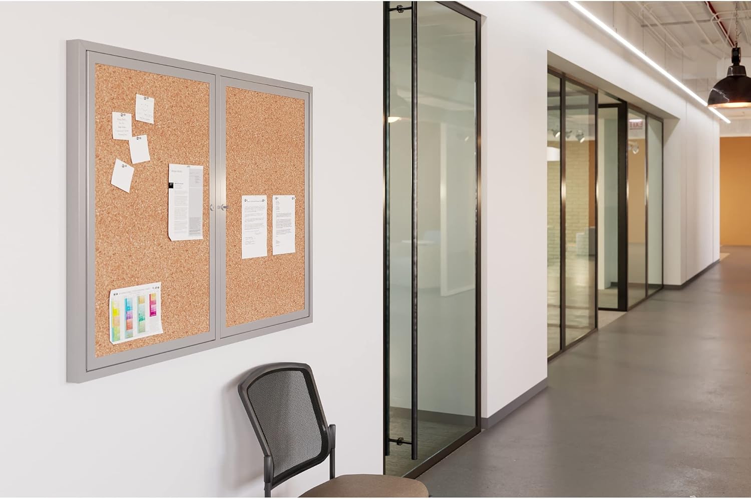 Keep your messaging readily visible with the WorkPro Enclosed Double-Door Cork Bulletin Board communication method for school, workplace, and community areas. Enclosed bulletin board with sturdy swing-out doors that lock for secure access to announcements, schedules, and other notices. Shatter-resistant glass holds up to frequent use. Natural cork bulletin board surface keeps a reliable hold on pushpins and tacks. Wall-mount hanging system included. Includes two keys.