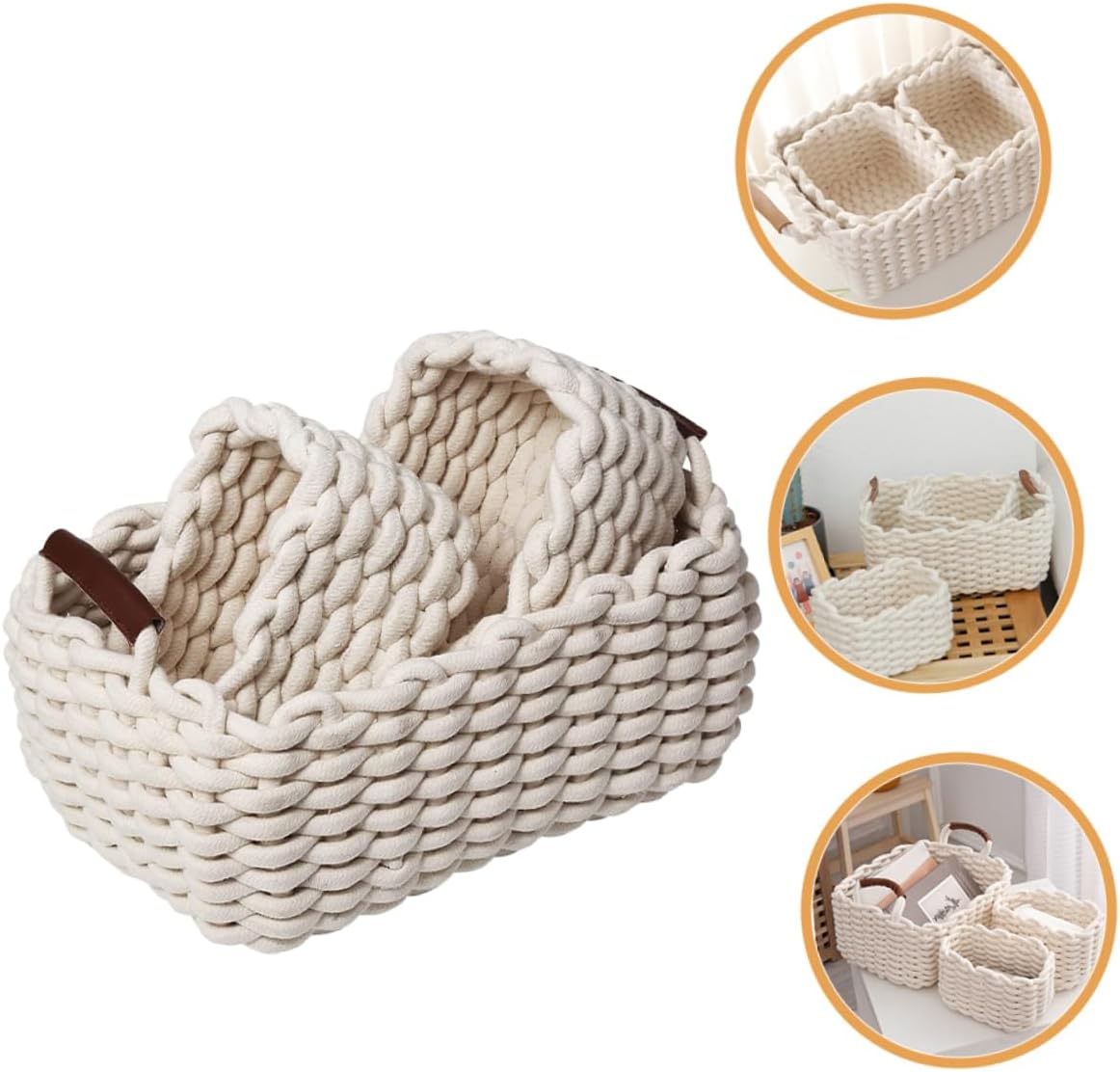 Package List 1 × Large Cotton Rope Woven Basket 2 × small Cotton Rope Woven Baskets Characteristics - Size: 18.00X14.00X13.00cm/7.07X5.50X5.11in small storage basket - Size: 36.00X20.00X19.50cm/14.15X7.86X7.66in shelf basket -Material:Cotton rope and leather Cotton Rope Woven Basket - Color: White Woven Storage Baskets -Product Info:Storage basket - The woven cotton rope basket can be placed on the desktop or used as a storage basket to save space. small storage containers - Made of cotton rope and leather, and . Easy to clean and maintain this woven storage basket. desk basket - The woven basket features a simple shape, convenient and in simple color, very multipurpose and practical woven baskets for organizing. - You can use this basket to organize dressers, add to your home decor or daily storage of personal items. woven baskets - With woven texture and simple shape design, delicate and versatile, it can easily match your home decoration style household storage baskets.Goods Descriptionstorage containers for organizing The woven basket features a simple shape, and with simple color, very multipurpose and practical.Cotton Rope Basket And it can be your good helper.small rope basket It makes your home and desktop tidier.woven rope basket Cotton rope storage basket is made of cotton rope and leather materials and can be placed on the tabletop.household goods storage basket The modern design can easily match your existing home decoration