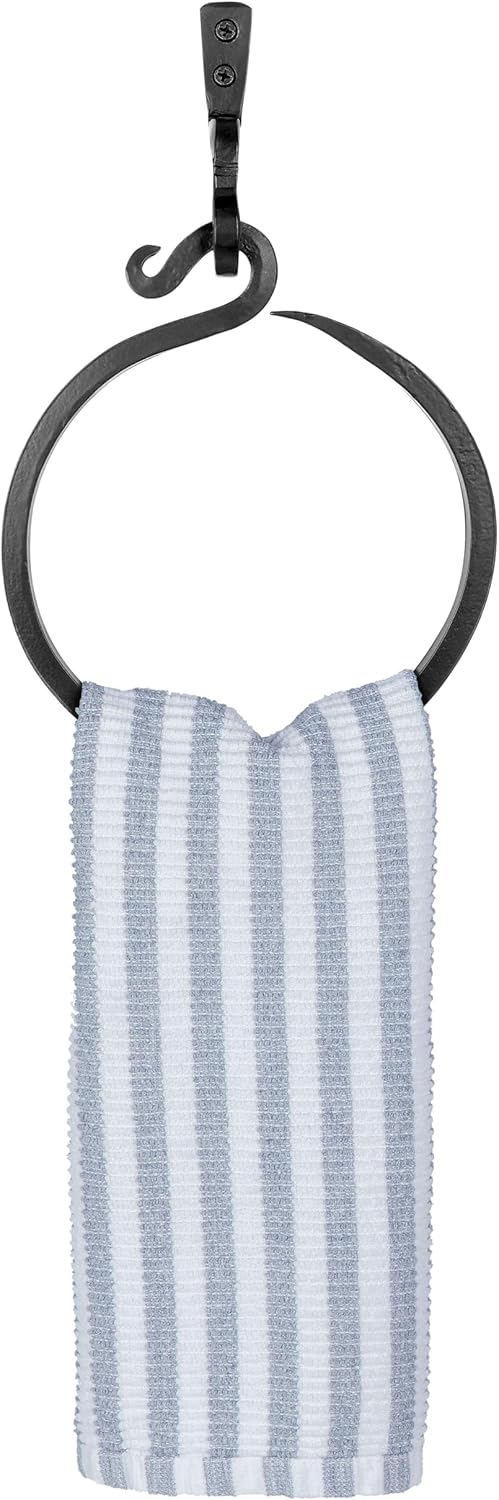 Blacksmith handmade wall mounted wrought iron decorative towel ring holder. A solid iron craft piece for bathroom or kitchen. Towel rack for bathroom or kitchen Measures 10.3 inches long, 6 inches wide and extends 2.2 inches from the wall.