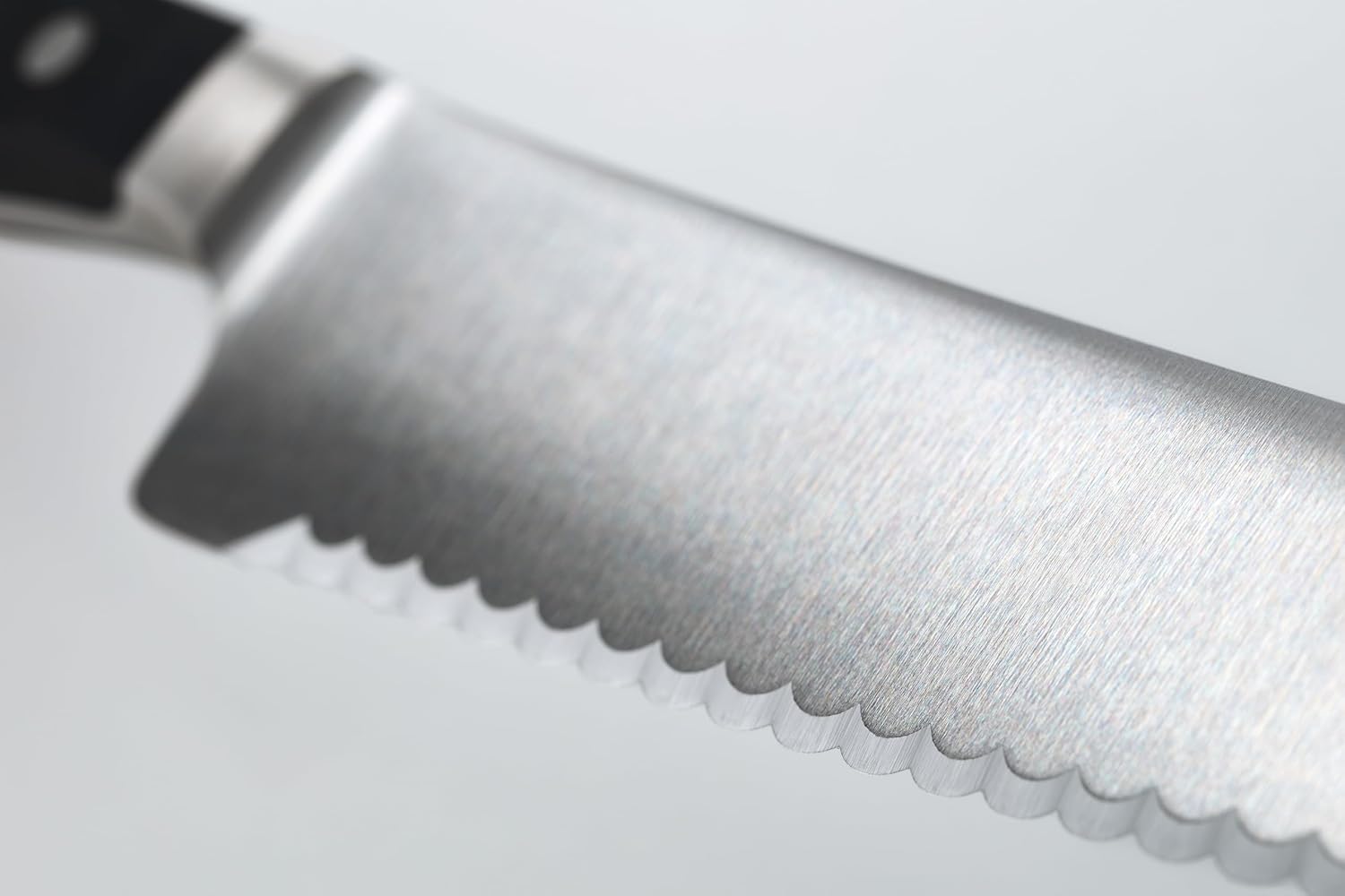 The super slicer has a long, scalloped blade which allows for smooth carving of thin slices of meat or breads with a thick crust.