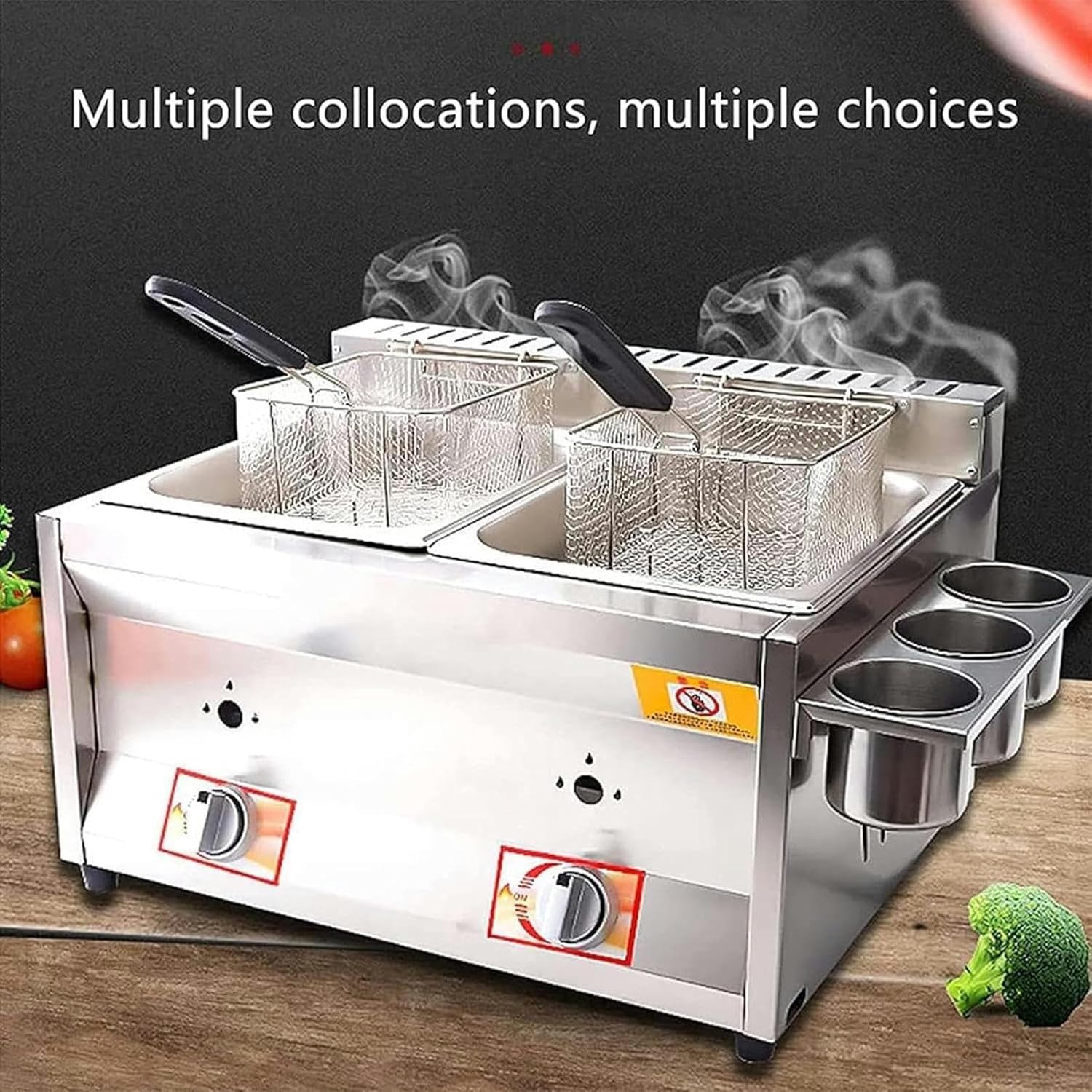 Our stainless steel fryers With double basket, you can cook two different snacks at the same time, easily prepare your favorite foods in the comfort of your home, this deep fryer is a must have for home, parties or snack bars.>>> Specification:Product name: deep fryerMaterial: Stainless steelHeating method: liquefied petroleum gas (gas)Capacity: 6L, 12LPot body size: 30x47.5x35cm/56.5x47.5x43cmInner pot size: 30×24×15cm>>> Features:- Multi-sided heat dissipation hole design, heat dissipation is more efficient.- Stainless steel, automotive-grade rust-proof and durable, a fusion of beauty and texture.- Large air duct design allows air and fuel to mix, burn more fully, and heat up faster.- Independent fire control switch, free temperature adjustment knob, you can control the firepower at will.>>> Notice:1. Keep away from children. Do not leave this product unattended when it is connected to an electrical outlet.2. To avoid sudden power outages, it is recommended to plug the fryer into a wall socket instead of a terminal block socket, and it is not allowed to plug both plugs into the same socket strip.3. It is strictly forbidden to use the frying pan to heat solid oil. Using solid oil can easily spoil the food. When frying explosive food, be sure to cover it to prevent oil from splashing!We are committed to providing quality service. If you have any questions, please contact us and we will respond to emails within 24 hours.