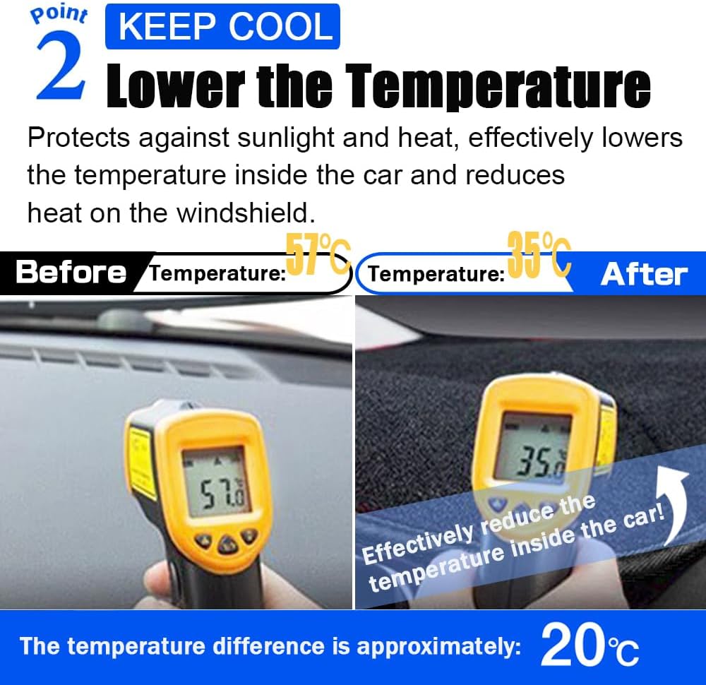 • 【Powerful Protector】UV rays can cause Dashboard cracks and warping.This dash not only cover blocks up to 99% of damaging UV rays but also reduce glare and reflections on your windshield, sunshine isolation and maintain your car interior temperature to stay cool,enhancing visibility for a safer and more comfortable driving experience in your vehicle.