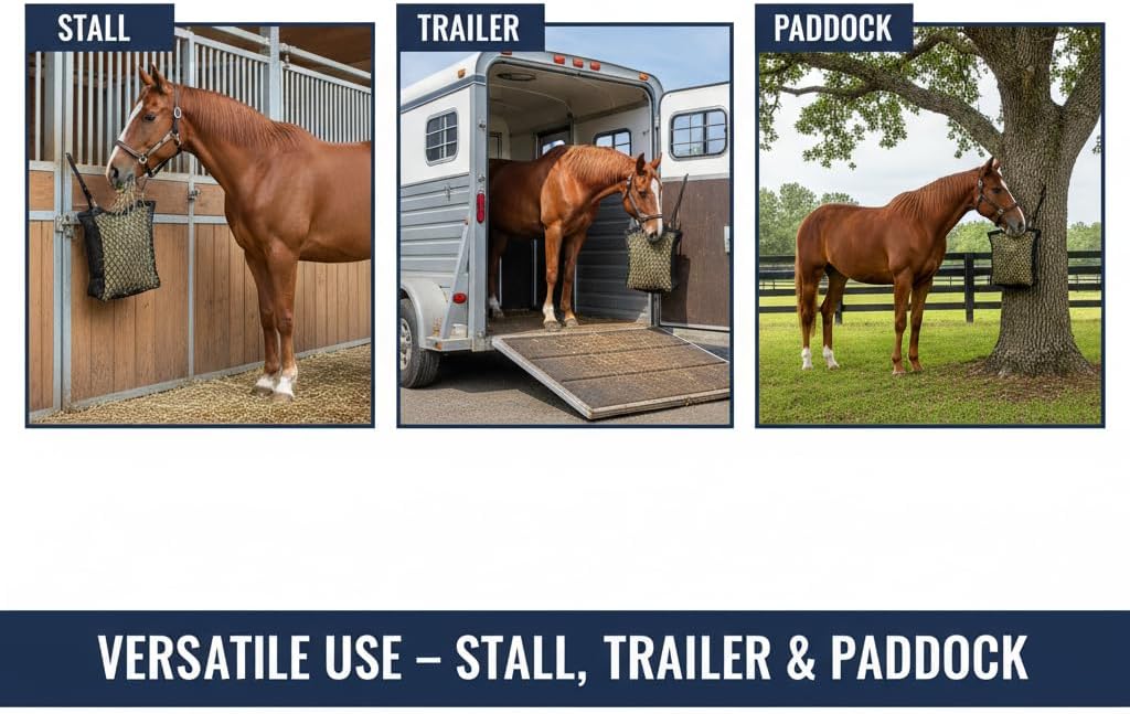 | Directions | Fill with 5–6 flakes of hay, hang securely at a safe height using the adjustable strap, and check regularly for wear. |