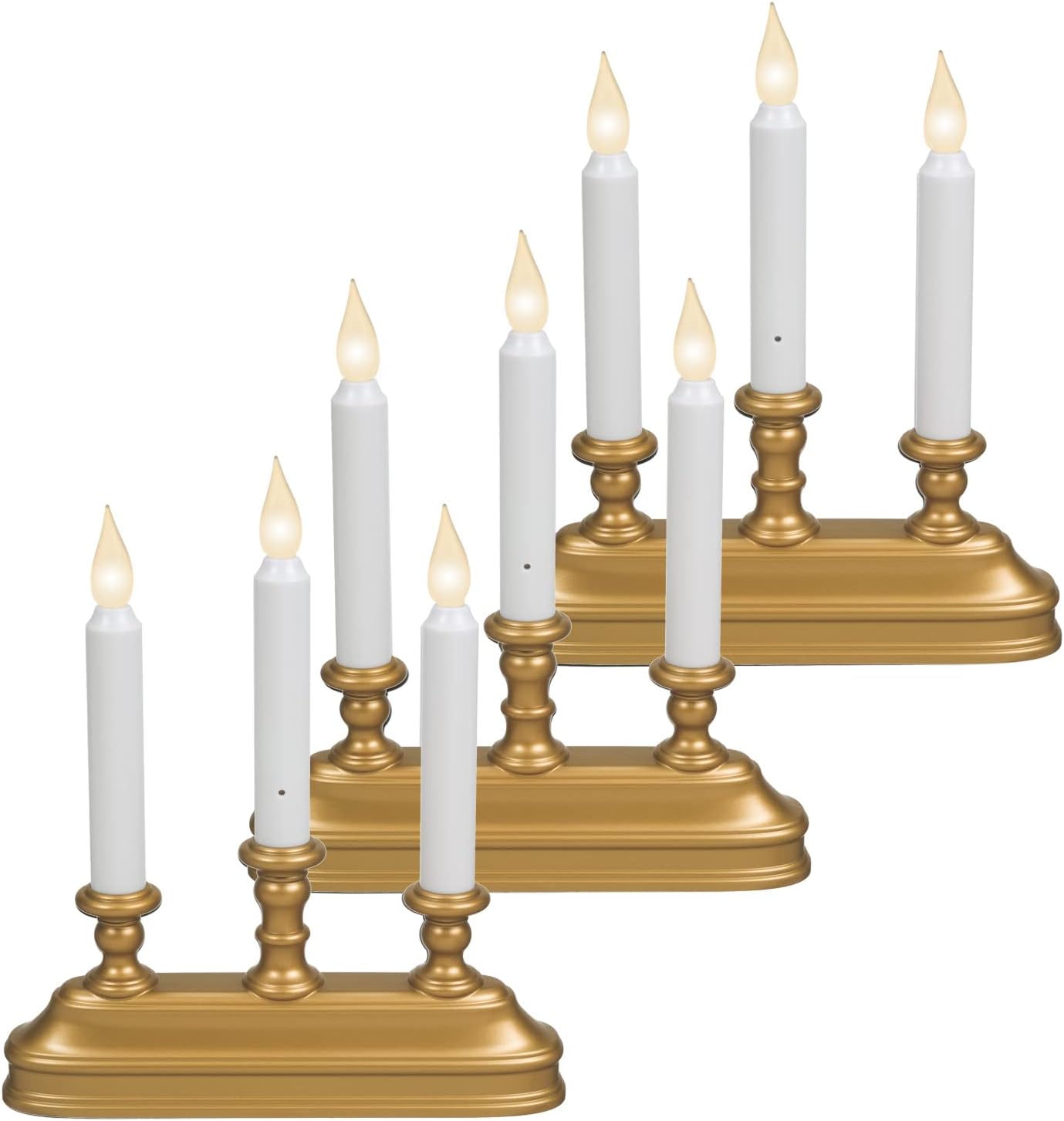This beautiful battery powered candle with candelabra base gives you a choice of warm white or amber LEDs. It also has a light sensor that automatically turns it on at dusk and off at dawn which makes it easy to use and help the 3 D batteries (sold separately) last the entire season (up to 45-days). Pick from 3 settings: off, flicker, steady on (no flicker). Also great for emergency use without any of the danger that comes with an open flame and hot wax.
