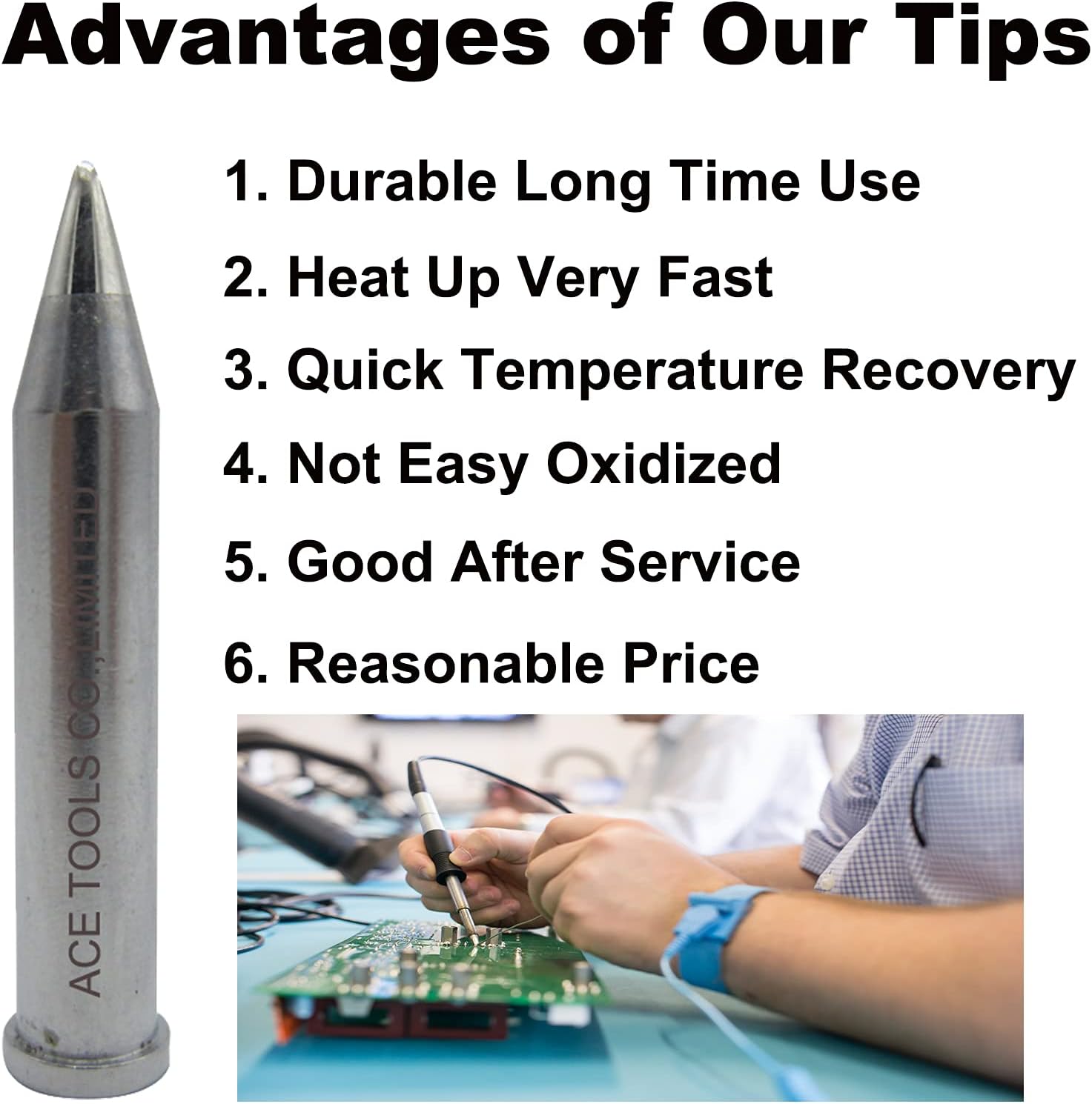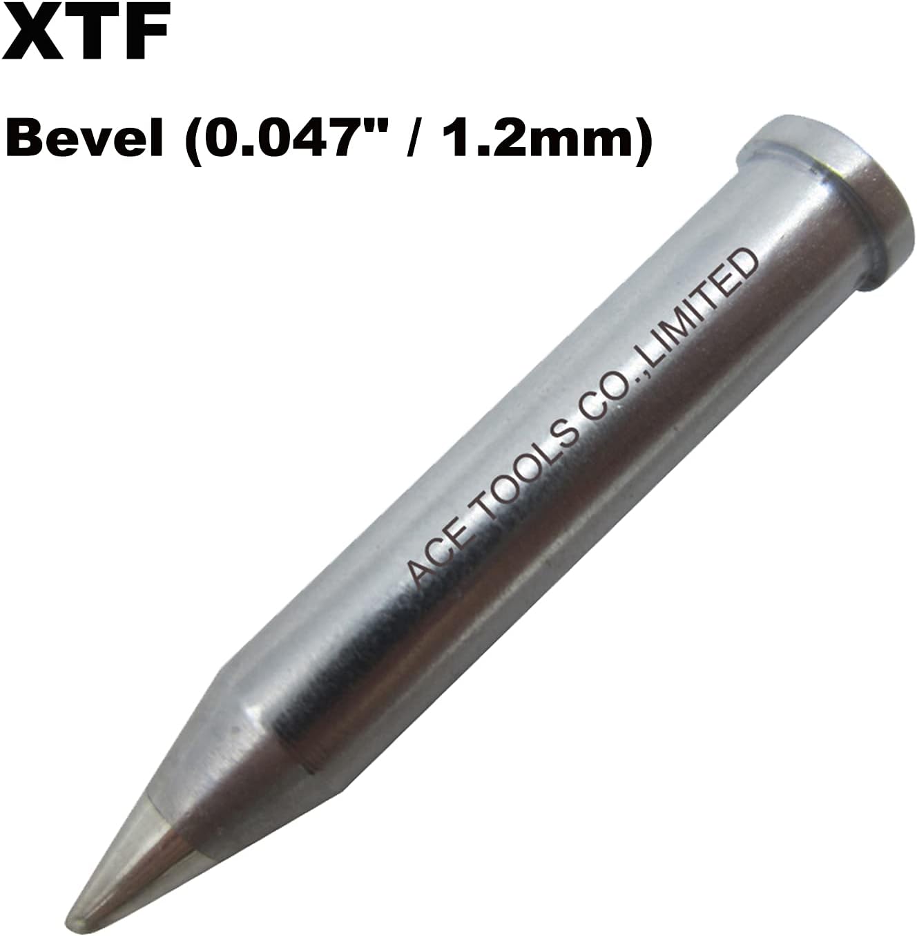 Name: XTF Bevel Single Flat 0.047" / 1.2mm Soldering Tip (High Quality Only) These are our Own brand "ACE" Usage: This type has a shape like a cone or column cut at a slant, which allows users to select the cut surface size depending on the workpiece. It is used for drag soldering and pre-tinning of lead wires. Warranty: We will agree to return tips and full payment refund when if you don't satisfy the tips even After Use