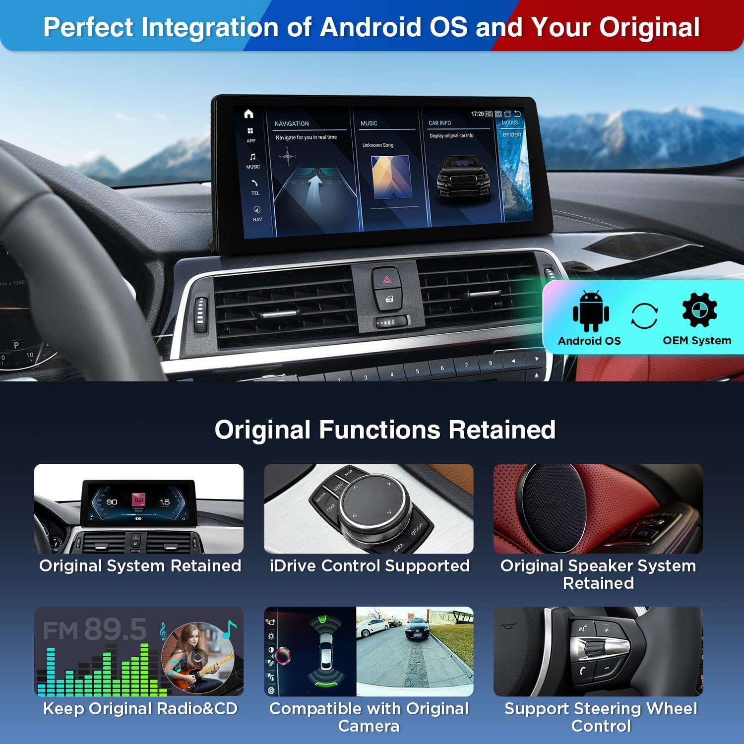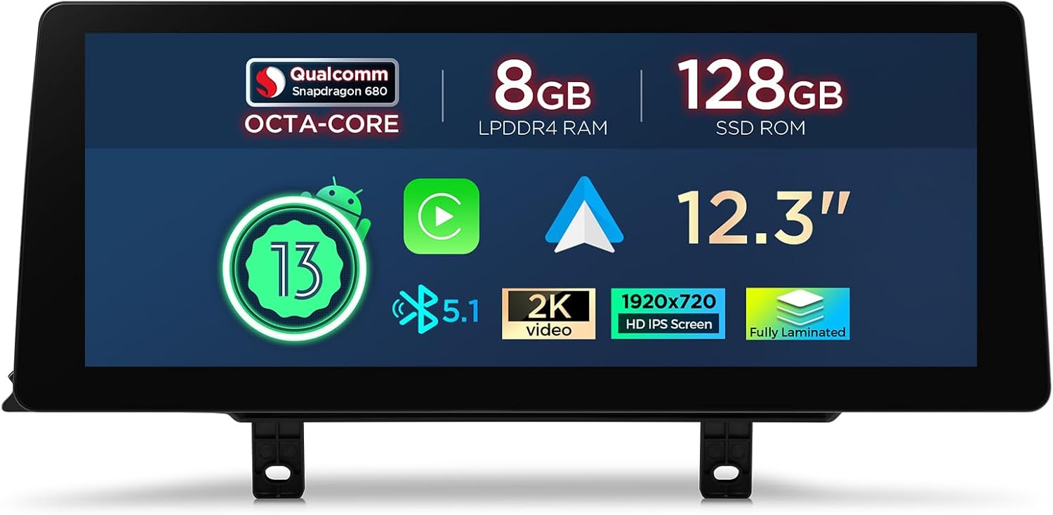 Applicable Models & YearsFor BMW 3 Series F30 F31 F34 F35 (From 2018) – Left-hand Drive with NBT EVO SystemFor BMW 4 Series F32 F33 F6 (From 2018) – Left-hand Drive with NBTEVO SystemMain Features※ Android 14 Qualcomm Snapdragon 680Octa-core with 8GB LPDDR4 RAM, 128GB Solid State ROM, Kyro 265 CPU※1920*720 with12.3” Touch ScreenUpgrades your driving experience with supersized entertainment※IPS Panel,178°Viewing AngleEnjoy viewing on a big-screen stereo without eye fatigue or discomfort.※Wireless CarPlay & Wireless/Wired Android AutoSeamlessly displays compatible apps from your smartphone to the large screen for safer operations and get access to voice commands of Siri/Google Assistant directly from the head unit.※Bluetooth 5.1Enjoy more steady connections and higher-quality transmission for hands-free calls and music streaming.※Dual Wi-Fi Band ConnectingWork with 2.4GHz or 5GHz band, providing faster speed flexibility.※Multi-task DisplaySimultaneous run two application like music and navigation on the12.3“ IPS screen for easier multi-tasking.※PIP-Picture in PictureNever miss a scene of your videos while you are switching to other apps on the car stereo.Optional AccessoriesNeed OBD Function? B09D3DVZVR / B015MU8UN6 / B07X9JXV28 / B08HQ9LQ9X optionalNeed TPMS Function? B07WQFKV5G / B07DKB4GD2 optionalNeed External DVR? B07MBYCG4C optionalNeed Reversing AHD Camera? B00GY3BVT6 optionalAccessories:1 x ISO Wiring Harness1 x Audio Cable1 x RCA Cable1 x GPS Antenna1 x USB Cable1 x 4G Antenna1 x Mini Speaker1 x Tweezers1 x Plastic Bracket1 x Audio Box1 x LVDS Cable1 x User Manual1 x Installation Instruction