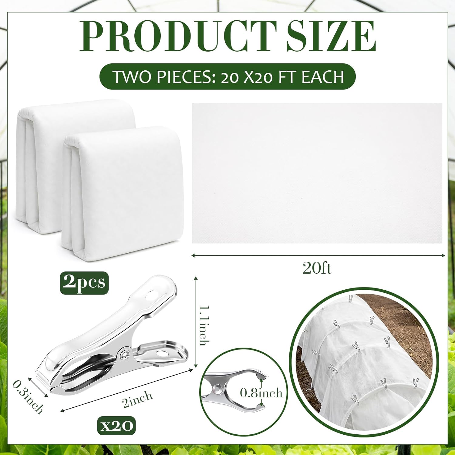 Features: Sturdy and Long lasting Made from sturdy non woven fabric, it resists aging and damage even with prolonged exposure to sunlight. The stainless steel clips are rust proof, allowing for repeated use, making it ideal for everyday gardening. Plant Sun Protection: Suitable for vegetable gardens, fruit trees, flower beds, and landscape plants, it effectively regulates temperature fluctuations and reduces wind damage to plants. The balanced shading effect allows plants to grow healthily in direct sunlight or breezy conditions. Specifications: Material: Non woven Color: white Size: Plant Sun Protection Cloth: about 20 x 20 ft/ 6 x 6 m Stainless steel clip: Approx. 2.17 x 1.18 inches / 5.5 x 3 cm, maximum opening width: approx. 0.98 inch / 2.5 cm Package includes: 2 x Plant Sun Protection Cloth 20 x Stainless steel clip Notes: Manual measurement, please allow slight errors on size. The color may exist a slight difference due to different screen displays.