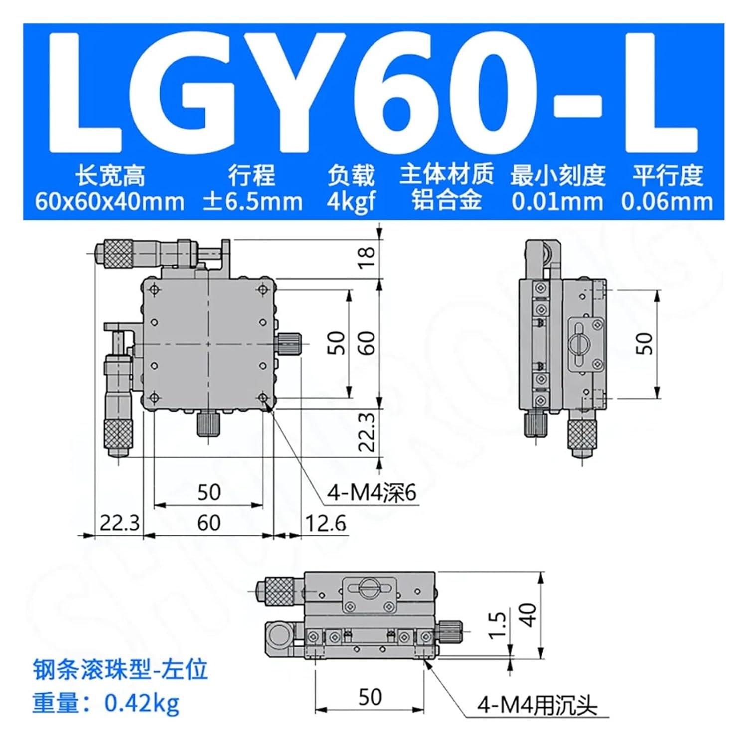 Roller Tablesscope:1. Travel axis: X&Y2X and Y travel 13mm3. Workbench size: 60*60mm4. Countertop thickness: 40mm5. Load capacity: 4kgf (39.2N)6. Bearings: ball bearings7.Main material: aluminum alloy8.Minimum size: 0.01mm9. Accuracy: 0.01mm10. Parallelism: 0.03mm11. Weight: 0.42kgModel: LGY60-C, LGY60-L, LGY60-R