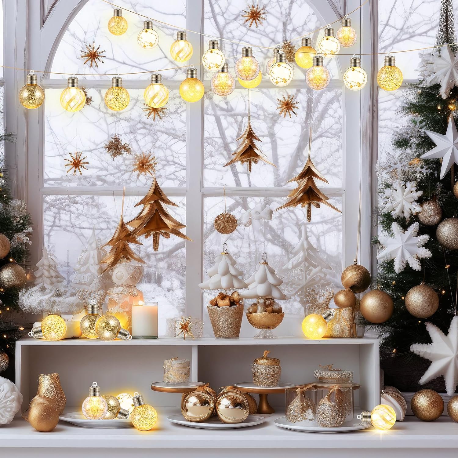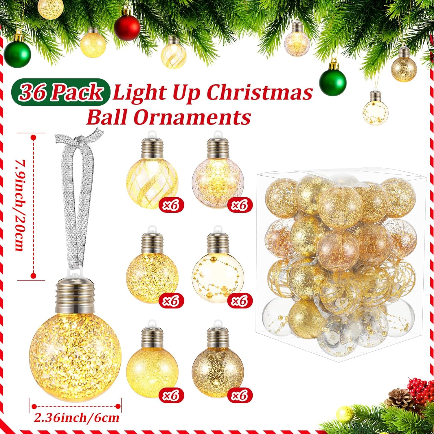 Features: Lighted Christmas Ornaments: the light feature will highlight your Christmas tree decorations, and will shiny when hung on the Christmas tree, creating a beautiful twinkling effectShatterproof Christmas ball Ornaments: our shatterproof Christmas tree Ornaments, made of sturdy plastic, ensure durability and longevity, allowing you to not worry Christmas tree decorations, ensuring your Christmas stays merry and brightSpecifications: Material: plasticColor: goldSize: Diameter: 2.36 inches /6 cm (D)Package includes: 36 x Lighted Christmas Ball OrnamentsNotes: Manual measurement, please allow slight errors on size. The color may exist a slight difference due to different screen displays.