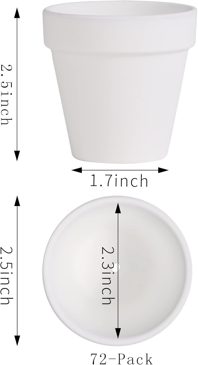 What’s in the Package 72 x 2.5 Inch white Terracotta Pots. Dimension Terracotta Pot:2.5*2.5*2.3 inches(L*W*H). Your Plants Like Them ❤First and foremost, terracotta pots help keep your plants healthy. ❤Because the clay is porous, water and air can pass through the sides of the pot. ❤This allows the soil to “breathe,” They’ve also got drainage holes in the bottom. ❤If you’re a bit over-enthusiastic about watering or have a plant that hates lingering dampness, terracotta is the answer. BENEFITS OF USING TERRACOTTA GARDENING POTS √Terracotta has many advantages for the gardener and flower grower. √One of the greatest is the fact that clay is completely natural, porous, and has thermal properties that make it an asset to plants. √Those who use terracotta know that the porous nature of clay means you cannot easily overwater plants, the roots can breathe, and the clay itself has excellent heat retention. √All of this adds up to better plant care. √Another plus is can tell by the color of the pot if the plant actually does need to be watered, terra cotta is is moist and darker in color when there is moisture still present in the soil. Tips ※Plants not included, you water sparingly and slowly, so the water gets evenly distributed through the soil without pooling at the bottom. ※Terracotta plant pots should be stored outdoors in winter. Because they are porous and retain some moisture, they are prone to cracking because the moisture in them will freeze and expand several times over the course of the winter. They’re easy to customize ● That said, terracotta is easy enough to paint if you do want to add some personal flair. ● So you can easily change things up if you’re bored with the plain look, without spending a bunch of money on artsy pots.