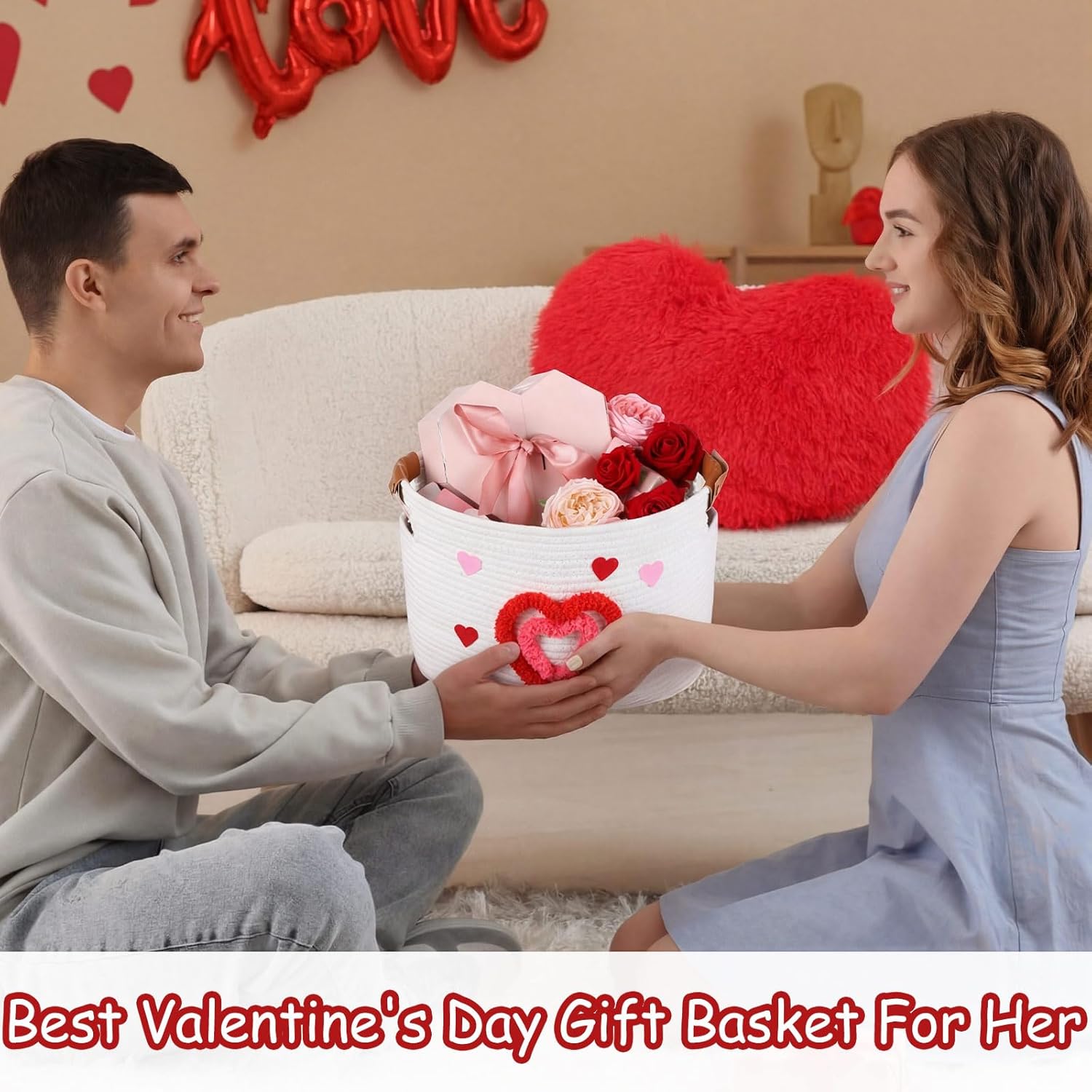 Features: Whether use as a standalone gift or filled with surprises, this basket offers versatility. It caters to different preferences, ensuring that your present is both practical and touching, leaving a lasting impression. By choosing our cotton rope basket, you're opting for a product that supports sustainability. It combines functionality with an environmentally conscious design. Specifications: Material: cotton rope Color: white, red, pink Size: about 15 x 10 x 9 inches Package includes: 1 x Valentine gift basket Notes: Manual measurement, please allow slight errors on size. The color may exist a slight difference due to different screen displays