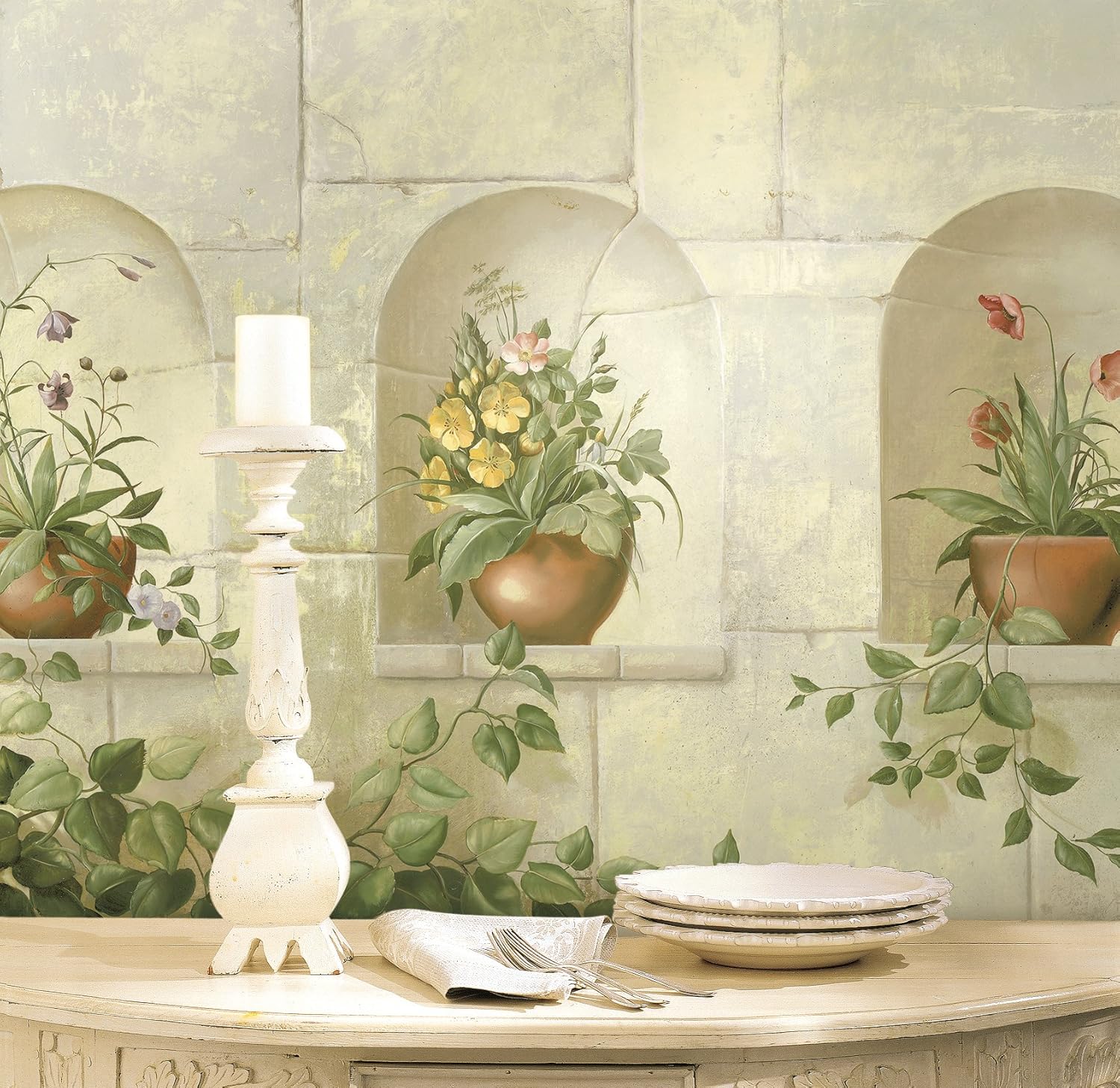 Product Description Three arched alcoves nestle into a softly aged stone wall, brightened by terra cotta pots of pretty blooms and ivy vines. Made in the USA. From the Manufacturer America's oldest and largest wallpaper manufacturer, York Wallcoverings has been manufacturing wallpaper since 1895 in its original location in Pennsylvania's Susquehanna Valley. With the largest studio of its kind in the world, our staff of talented artists interprets the best in color and fashionable interiors trends for the wallpaper industry, produced with skilled hand craftsmanship and state-of-the-art technology. We are the preeminent source for color, trend, authenticity of design, quality and customer care within our industry across the globe.
