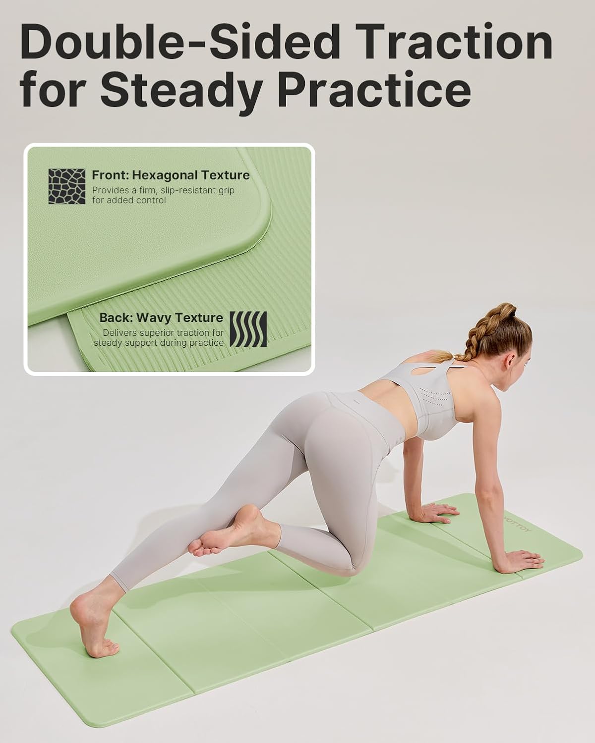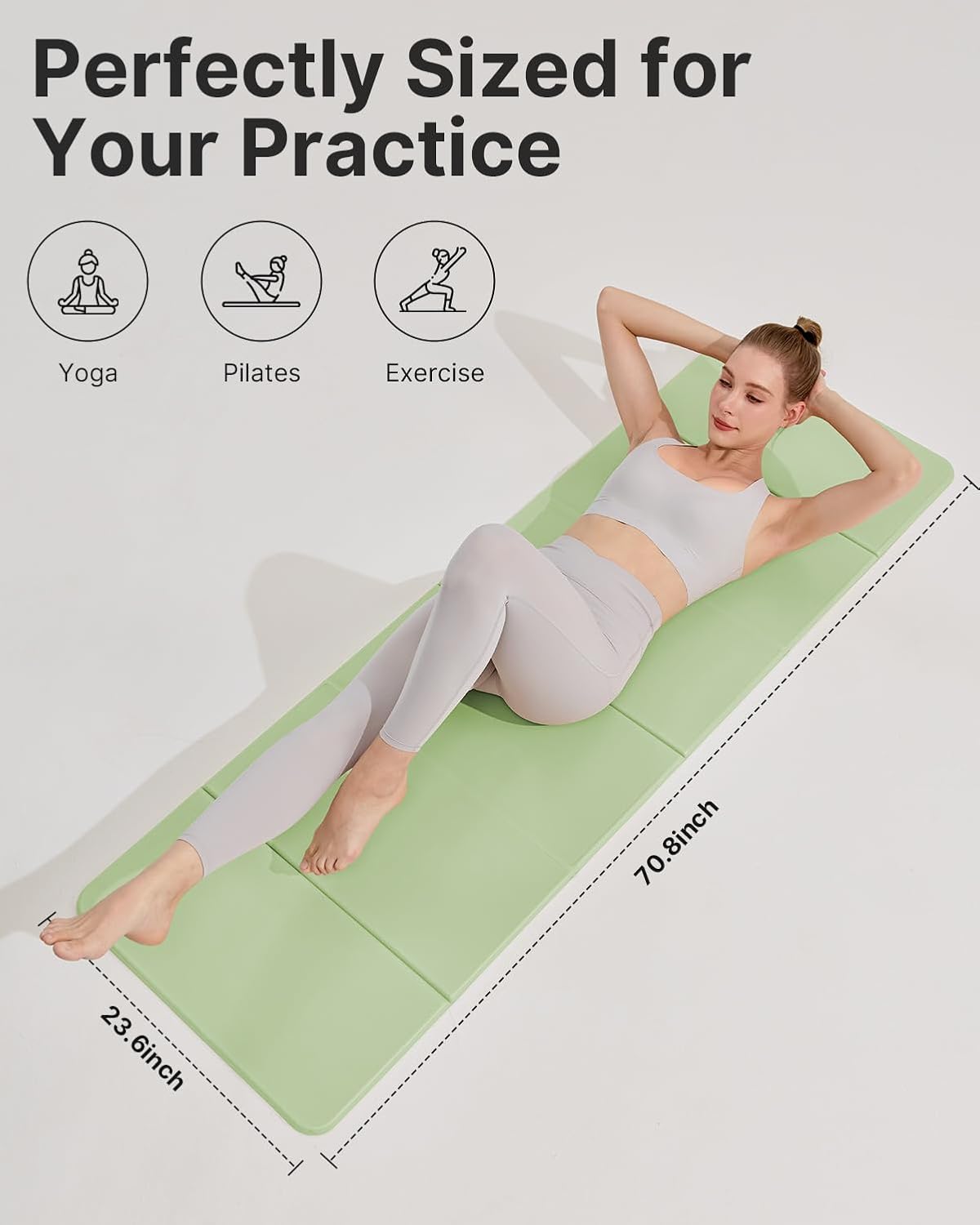 Product DescriptionProduct FeaturesThe Ultimate Space-Saver: Tired of bulky rolls? This foldable yoga mat is designed to fold into a neat rectangle in seconds. Whether you're heading to a local studio or catching a flight, this travel yoga mat fits effortlessly into your lifestyle without the hassle of traditional mats.Eco-Friendly & Skin-Safe: Crafted from premium high-density POE, our folding yoga mat is 100% latex-free and odorless. It provides a safe, non-toxic surface for your daily practice, ensuring that this foldable yoga mat stays perfectly flat and resilient use after use.Advanced Double-Sided Traction: Never worry about sliding again. This travel yoga mat packable design features a high-performance textured surface with a hexagonal grip on top and a wavy anti-slip bottom that locks firmly to any floor, providing the stability you need for advanced poses.Extra-Thick Joint Support: With its 12mm high-density cushioning, this foldable yoga mat effectively absorbs impact to protect your knees and spine. It offers the same premium support as a standard mat but with the unmatched portability of a travel yoga mat.SpecificationsMaterial: Premium High-Density POE(Latex-Free & Odorless)Expanded Size: 72" x 24" (Standard Full Size)Folded Size: 23.6" x 11.8" x 2.8" (Ultra-Compact folding yoga mat design)Thickness: 12mm High-Density CushionWeight: Lightweight for easy transport as a travel yoga mat packable solution.Package Includes1 x Foldable Yoga Mat1 x Custom-Fit Carrying Bag (Perfect for your travel yoga mat needs)1 x Instruction ManualPro Tips for UseUnfolding: Upon first use, lay your foldable yoga mat flat for a few minutes; the high-resilience POE will naturally smooth out any fold lines.Cleaning: To maintain the superior grip of your travel yoga mat, simply wipe it down with a damp cloth and mild detergent after intense sessions, then air dry.Storage: When not in use, keep your folding yoga mat in its compact folded state to save space under your sofa or in your closet.Travel: This travel yoga mat packable unit is designed to fit most standard carry-on luggage, making it the perfect companion for workouts on the go.