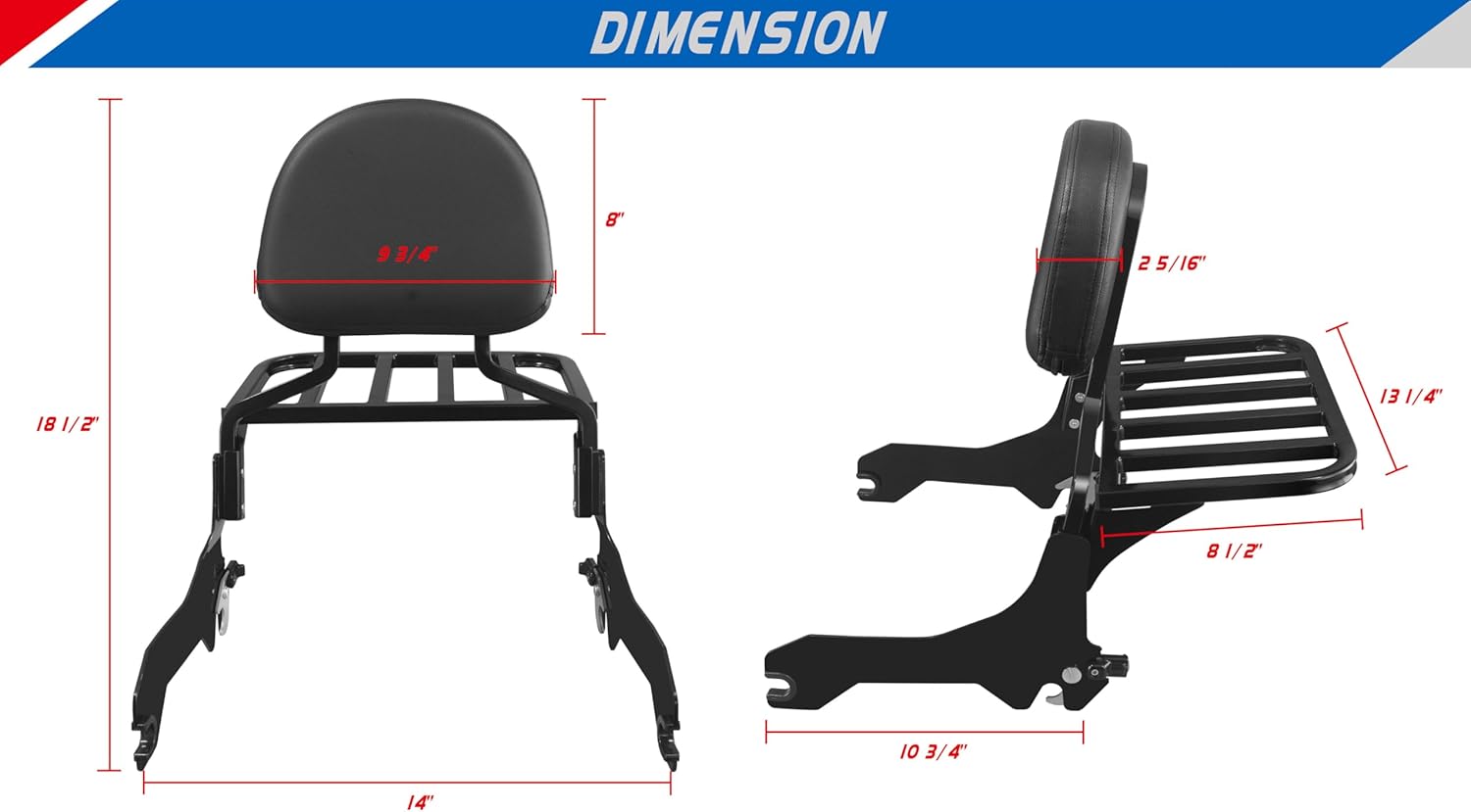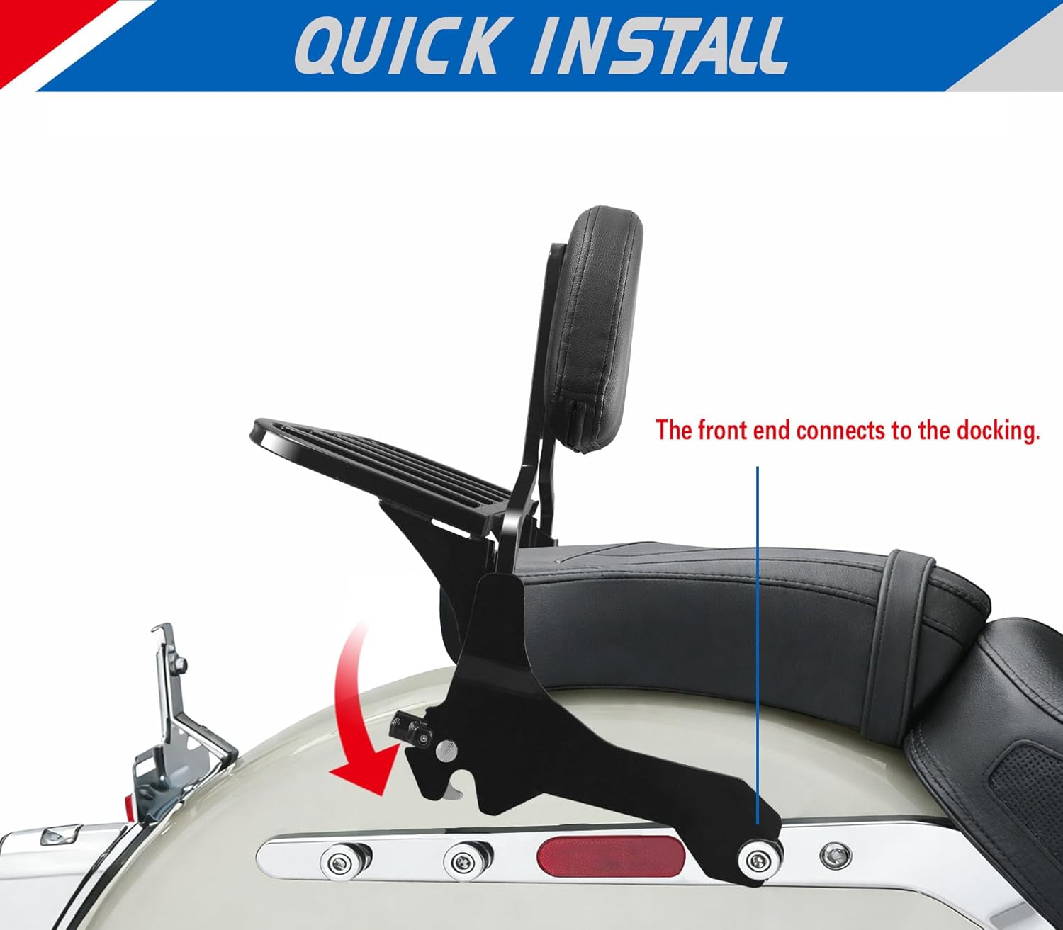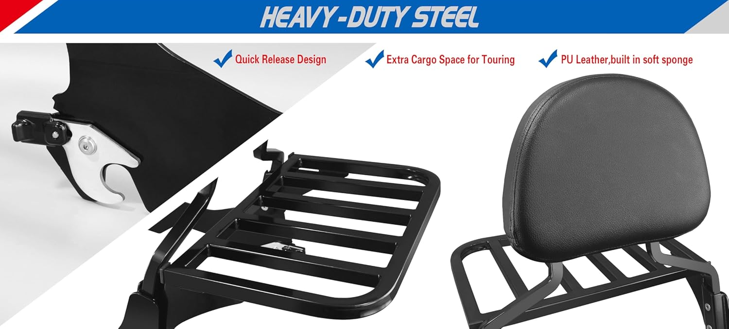 The Upright Rear Passenger Backrest Sissy Bar with Luggage Rack & Docking Hardware Kit is Compatible with Harley Softail Breakout 2018-2026.Upgrade your motorcycle with a detachable passenger backrest sissy bar designed for comfort, durability, and classic touring style.This motorcycle passenger backrest provides stable back support for passengers during acceleration, braking, and long-distance riding. The cushioned backrest pad helps reduce fatigue and improves comfort, making it ideal for touring riders and weekend trips.The sissy bar frame is constructed from heavy-duty steel tubing to ensure excellent strength and durability. A black powder-coated finish helps resist corrosion, scratches, and harsh weather conditions, allowing the backrest to maintain its appearance even after long-term use.Thanks to the detachable design, the backrest can be easily installed or removed depending on your riding needs. Keep it installed when riding with a passenger or remove it quickly for a clean solo riding look.Installs quickly using compatible docking hardware. Simply mount the sissy bar to the docking points for a secure fit—no drilling or complicated modifications required.Whether you’re commuting, cruising through the city, or heading out on long touring rides, this passenger backrest sissy bar offers both style and comfort for your motorcycle.
