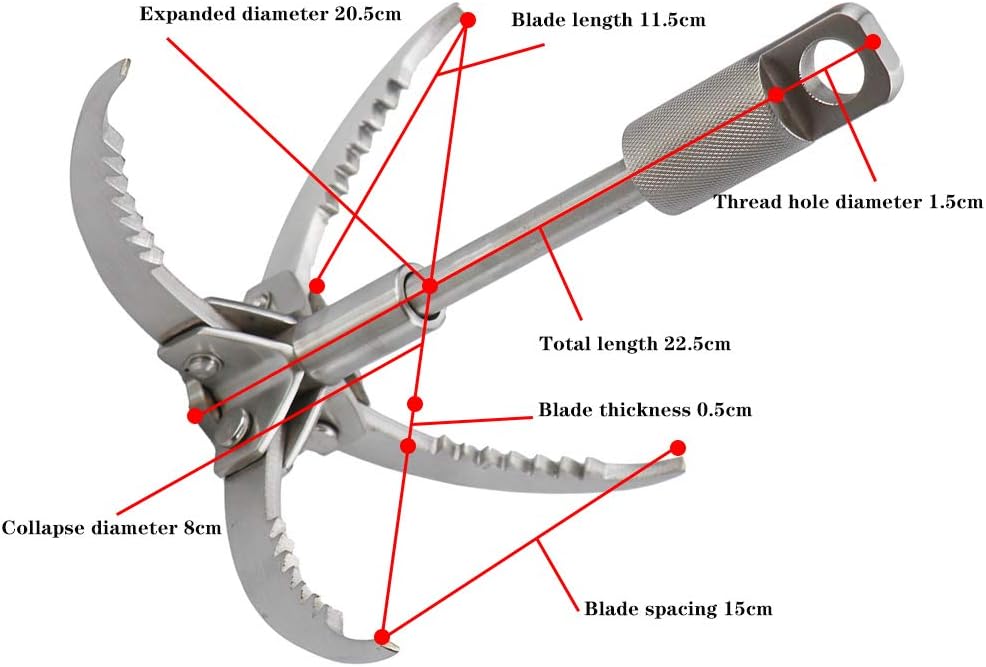 Product specificationProduct name: outdoor new stainless steel large flying tiger clawProduct material: German spring steelProduct color: silverProduct Size : Folding size: 80*225mm, Expanded size: 205*225mmThread hole diameter 15mmProduct weight about 875gProduct features: Using spring steel, integrally cast, the claw hook is heat-treated by oil quenching and high temperature, with high hardness and good wear resistanceProduct use: Mountaineering hook/flying tiger claw can be used in outdoor mountaineering activities, outdoor wilderness requirementsUse under high-intensity survival activities, outdoor adventure activities, etc.