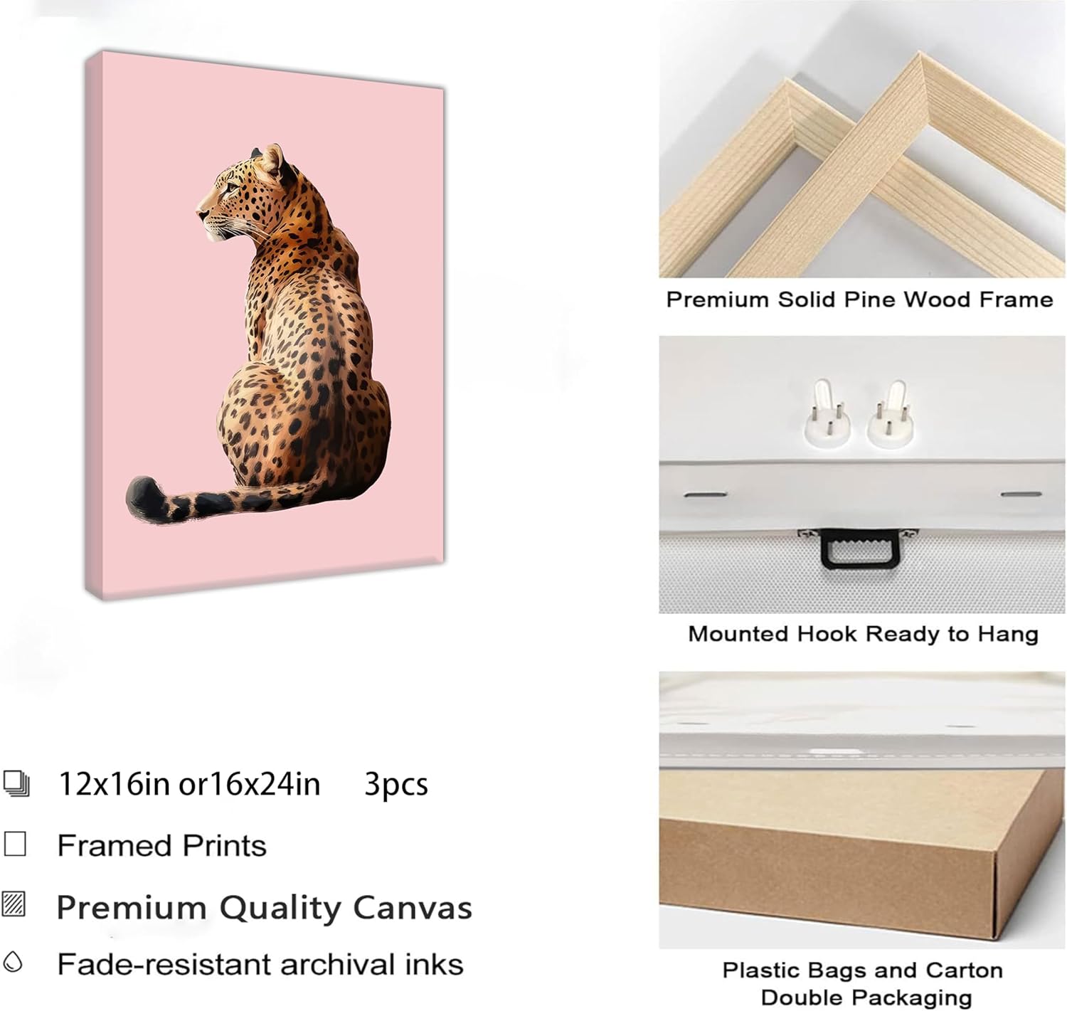 • Stylish Leopard Wall Art: Pink cheetah wall art comes in 12x16"x3 or 16x24"x3 sizes, excluding frames. These chic unframed wall art prints make a beautiful artistic addition to your room with their unique artistic look.