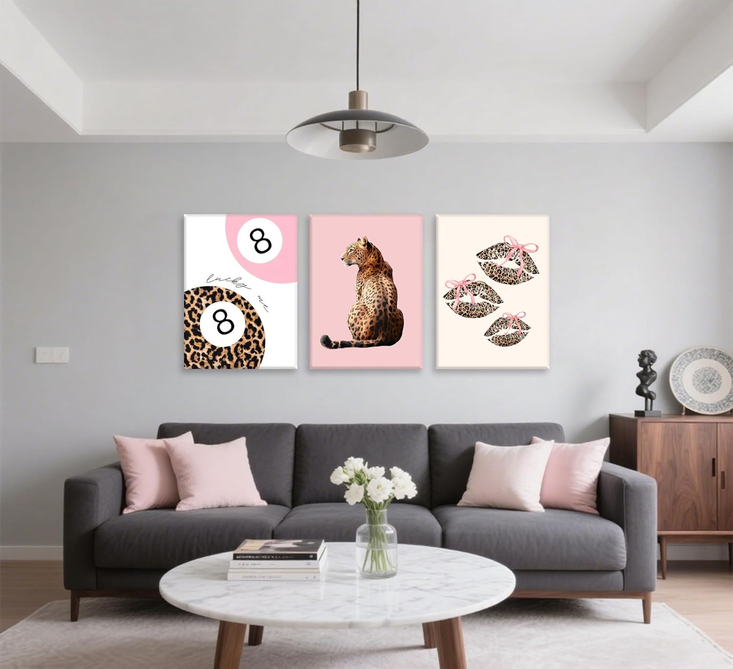 • Stylish Pink Leopard Wall Decor: Elevate your space with our stylish Pink Leopard Bow Canvas Wall Decor Set! Featuring a trendy lips leopard and lucky 8 ball design, this beautiful set of 3 prints is perfect for creating a chic and stylish aesthetic in any girl's bedroom, apartment or dorm