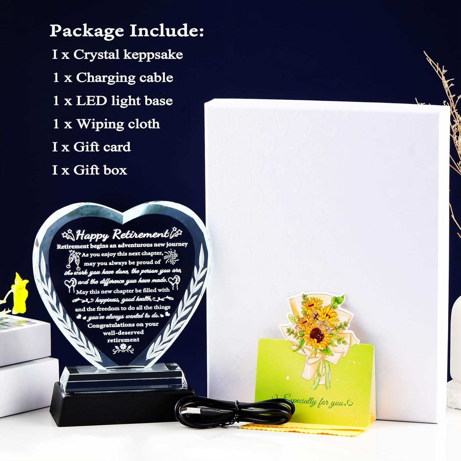 Are you looking for the perfect retirement gift for someone who is about to retire? By gifting a crystal keepsake with a heartfelt message, you are not only celebrating the retiree's past achievements but also encouraging them to embrace the new possibilities on the horizon. It truly is a thoughtful way to honor their journey and wish them well in this exciting new chapter of life! Happy Retirement! Product Specification: Material: K9 Crystal Feature: Laser engraving Crystal Size: 5.9 "x 5.5" x 1" Package Includes: 1 x Crystal keepsake, 1 x Gift box, 1 x Gift card, 1 x Wiping cloth, 1 x LED light base, 1 x Charging cable