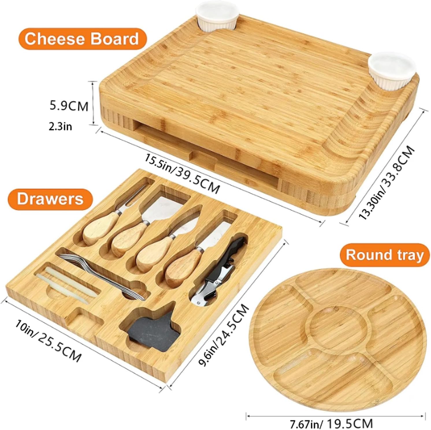 Product Name: Bamboo Cheese BoardFeature:Eco-FriendlyMaterial:BambooCheese Tools Type:Cheese Boards & TraysType:Cheese ToolsKitchen Supplies:Bamboo Cheese Board And Knife SetCutlery Type:Large Charcuterie BoardApplications:Unique Housewarming For Wedding For PartyUse:Food Tray Cheese PlatterMaterial: BambooSize: 39 x 33 x 5cm/15.3 x 12.9 x 1.9inOrigin: Mainland ChinaManufacturer contact information: Xiuying District, Haikou City, Hainan Provincequantity: 1